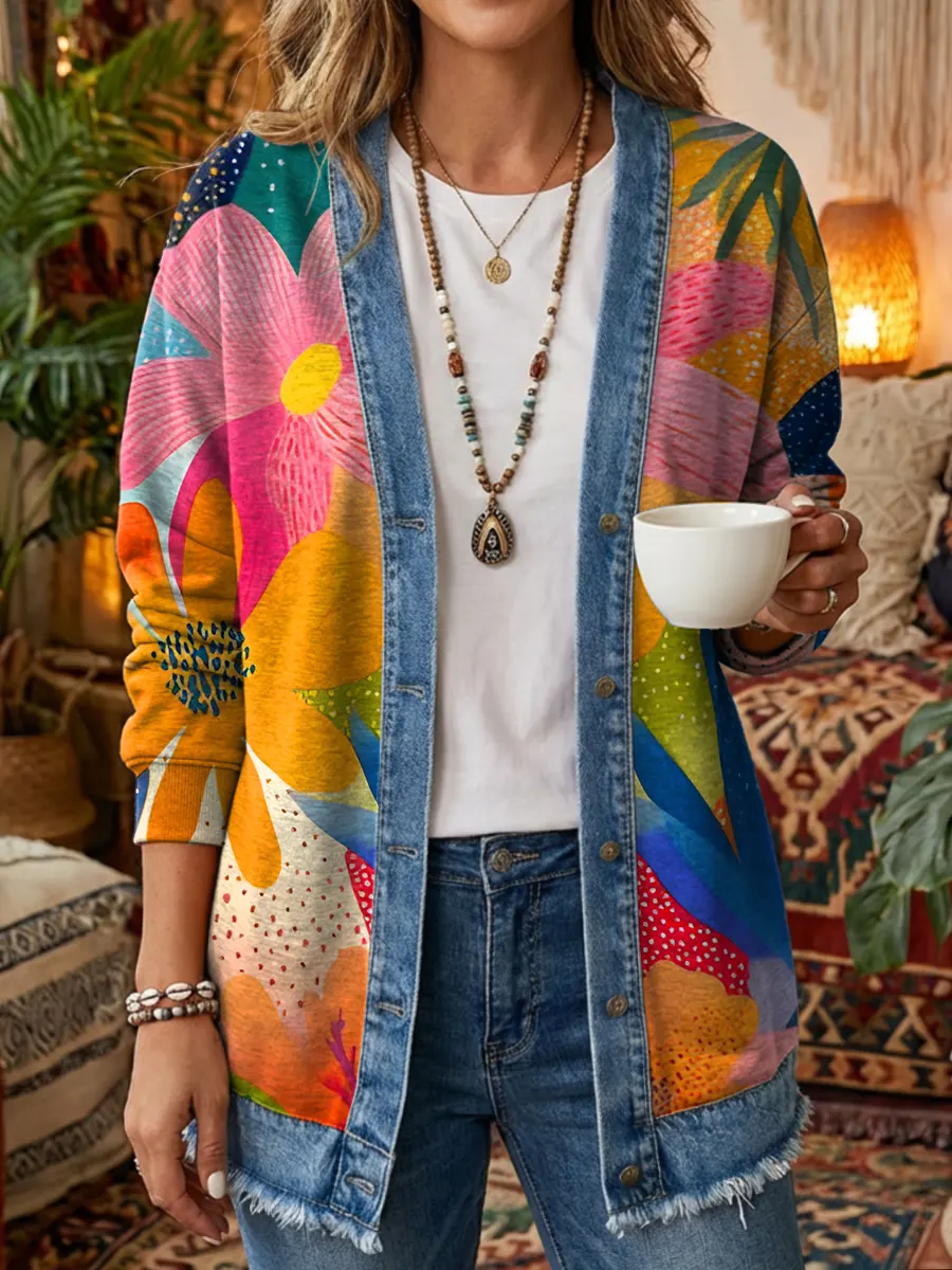 Ethnicity Colorful Flowers Women's Art Print Casual Long Sleeve Denim Patchwork Shirt Coat