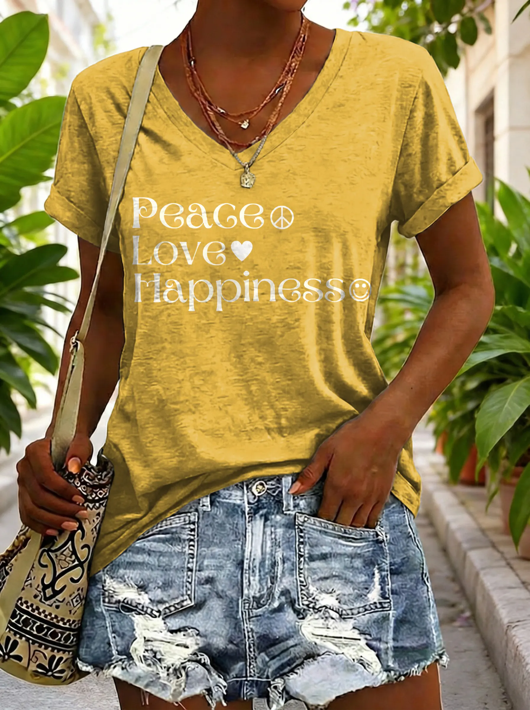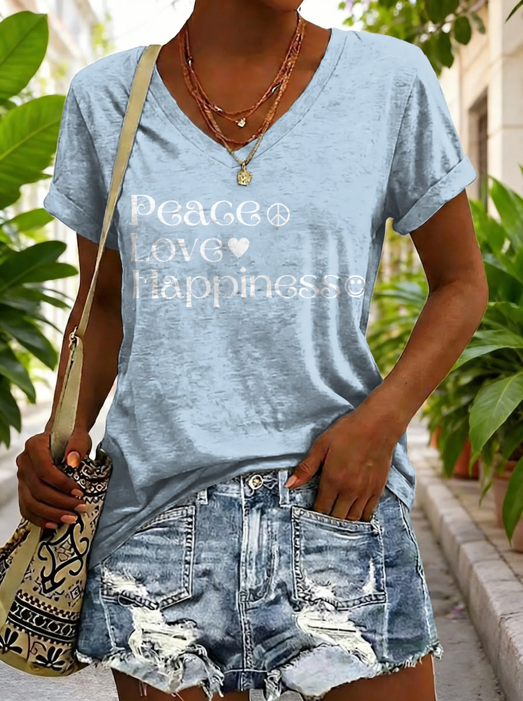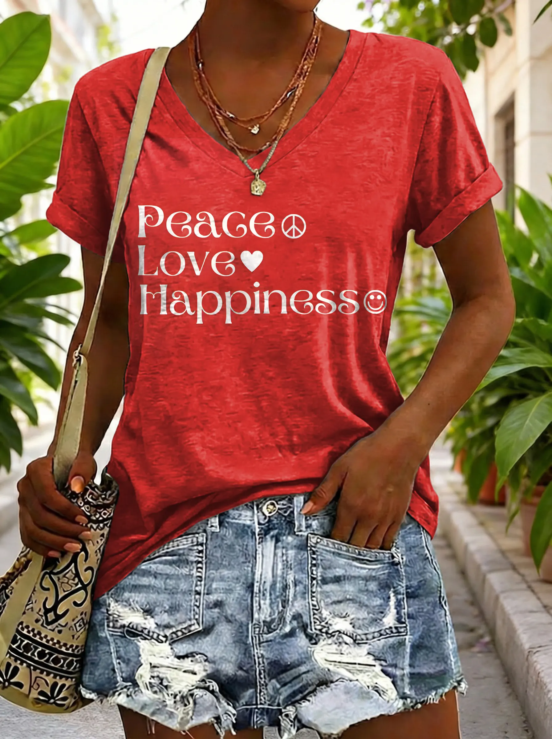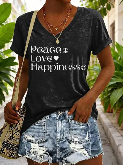 Hippie Peace Love Happiness Women's V-neck Print Casual T-shirt