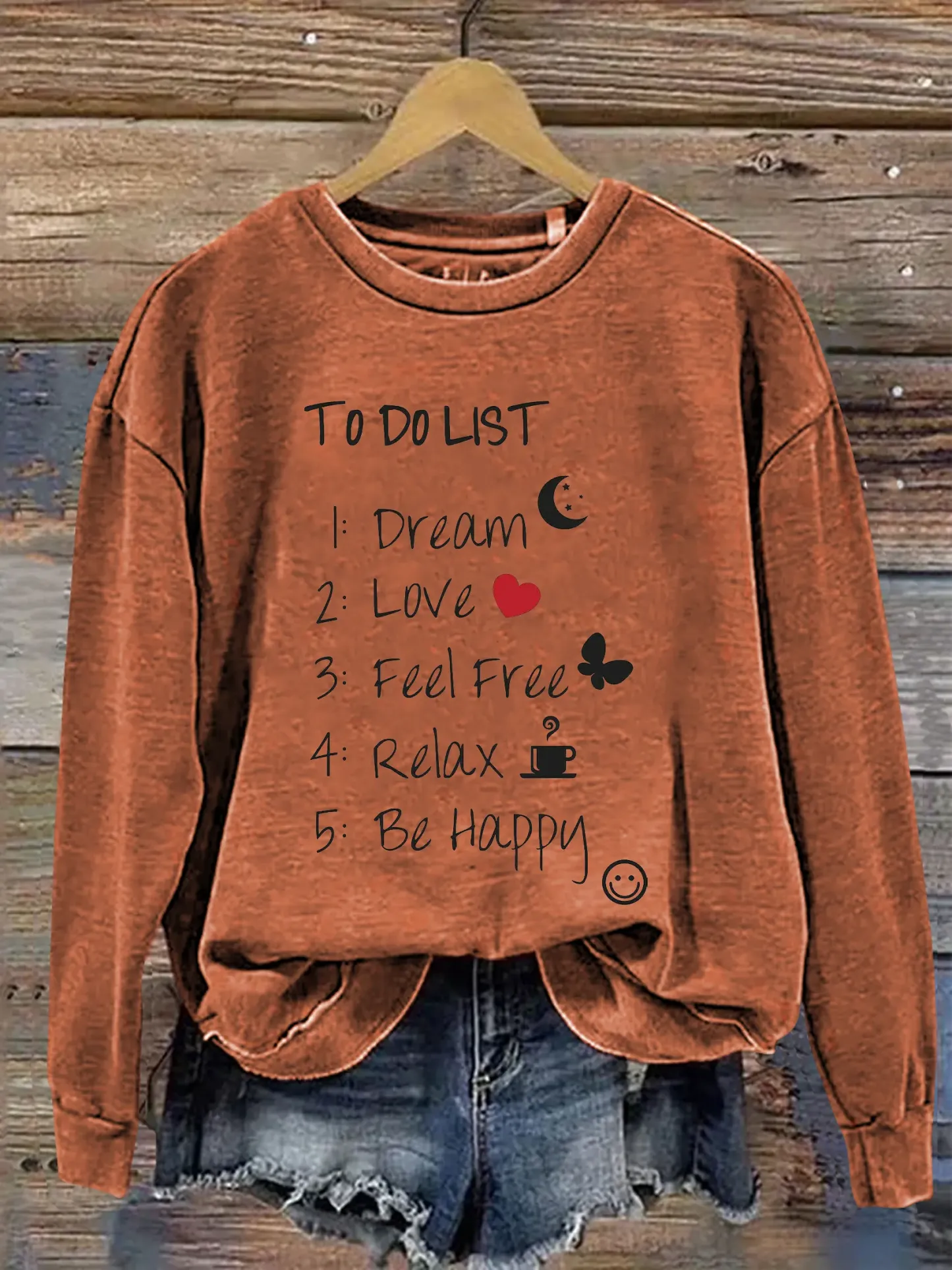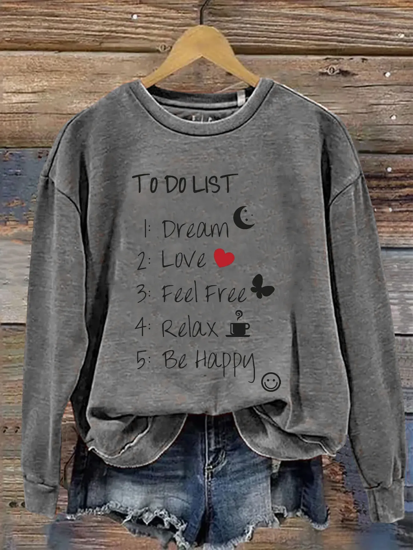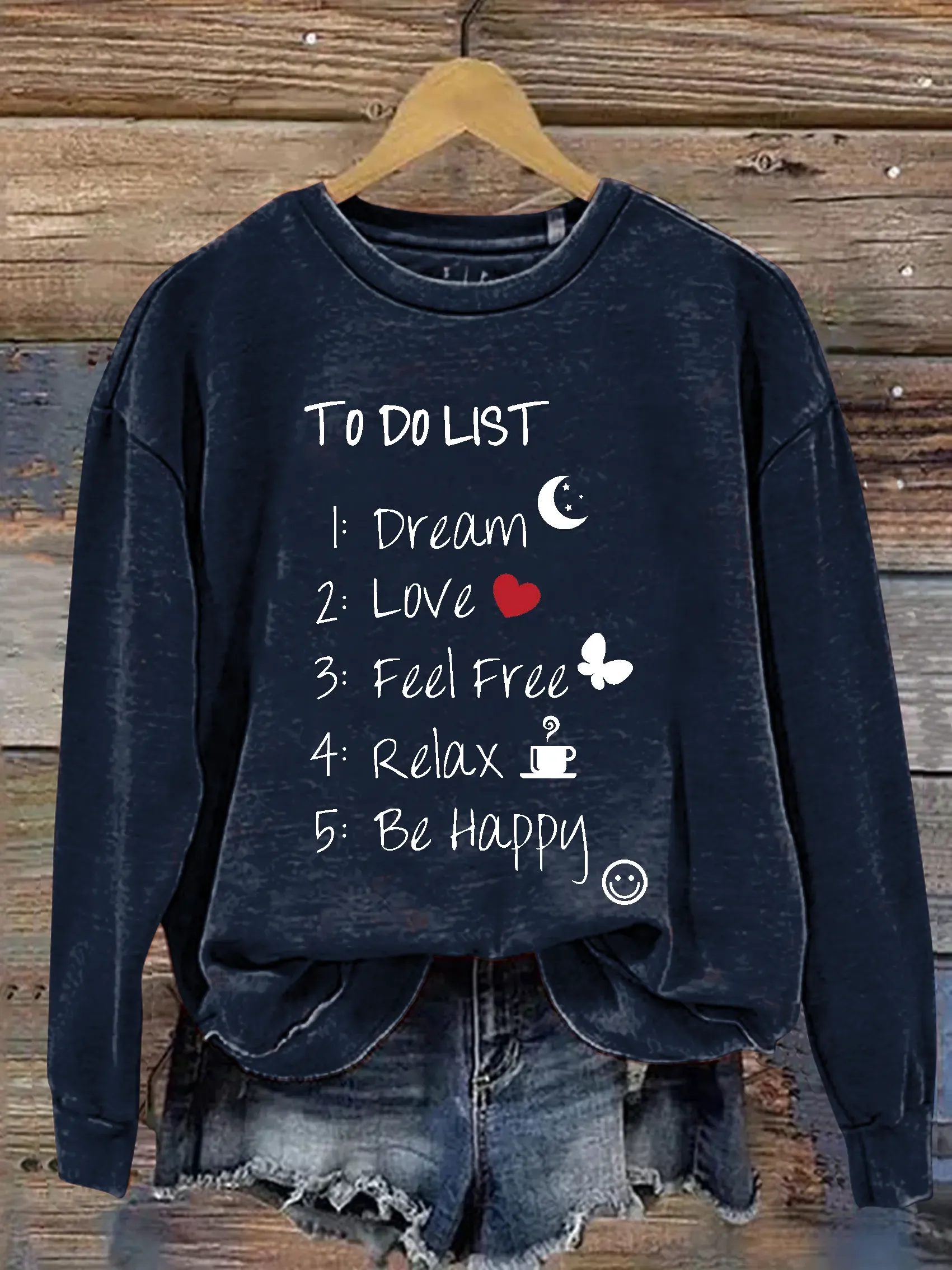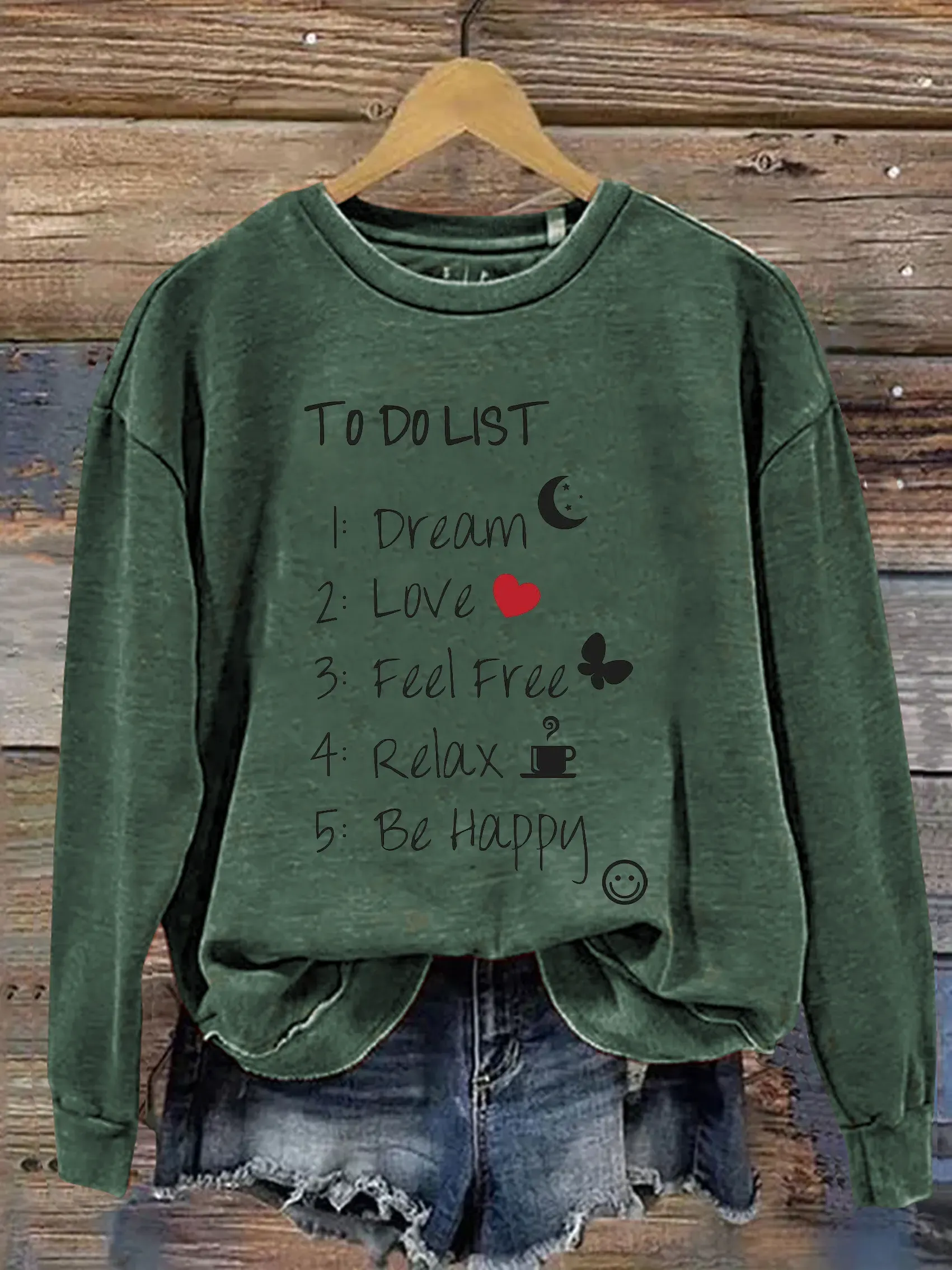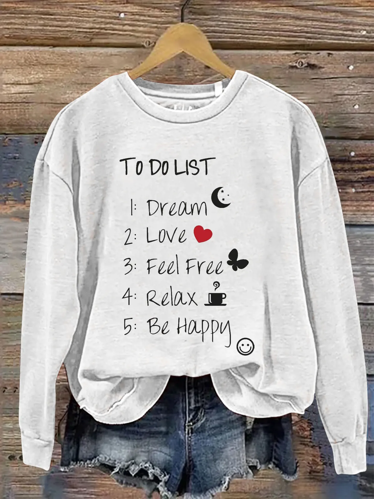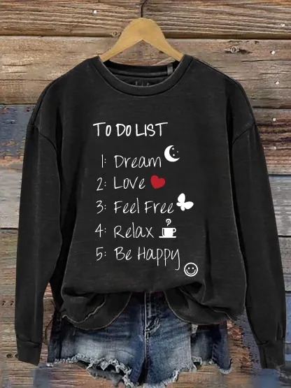 To Do List 1: Dream 2: Love 3: Feel Free 4: Relax 5: Be Happy Print Casual Sweatshirt