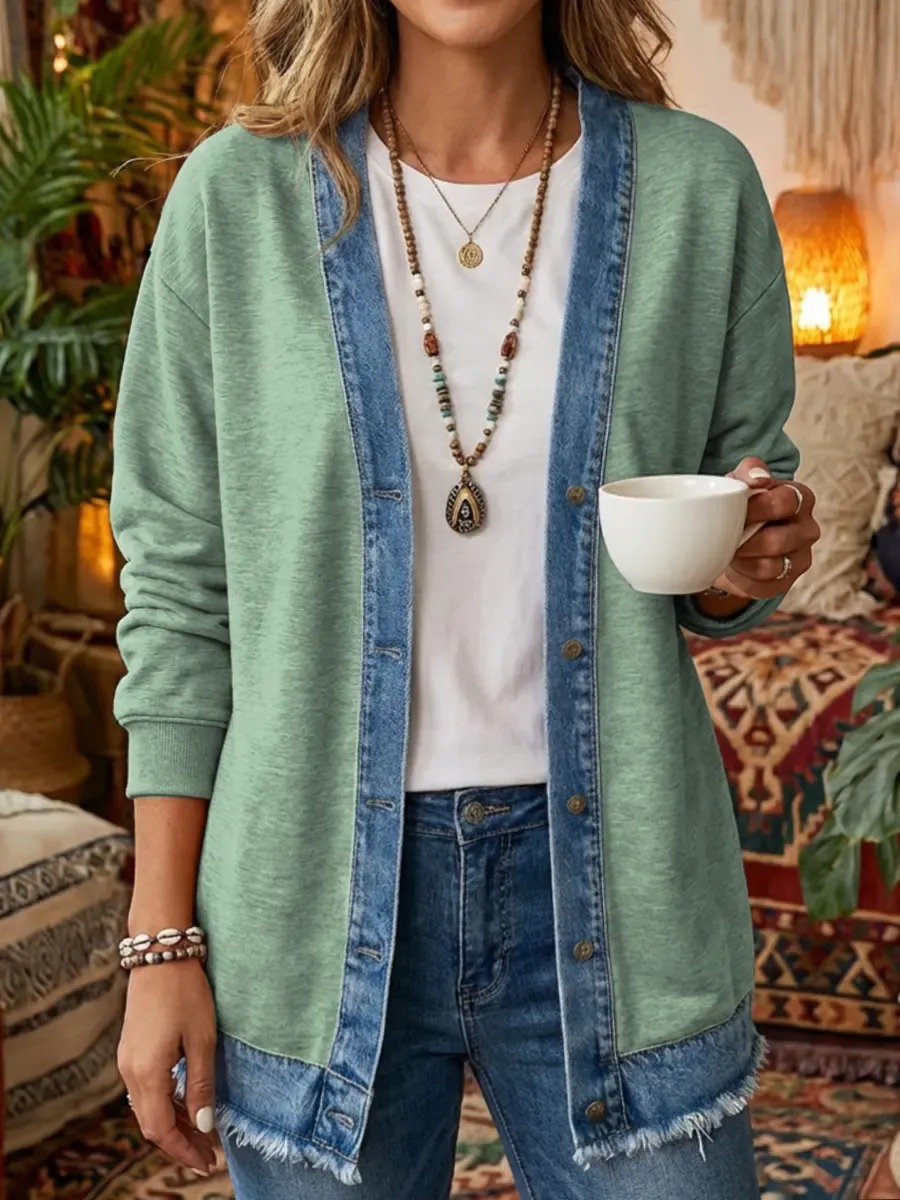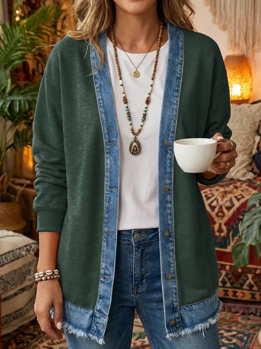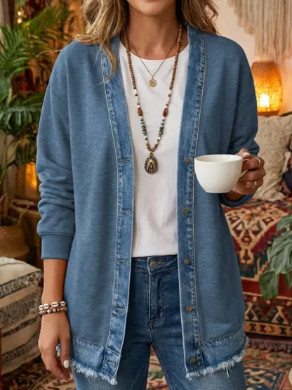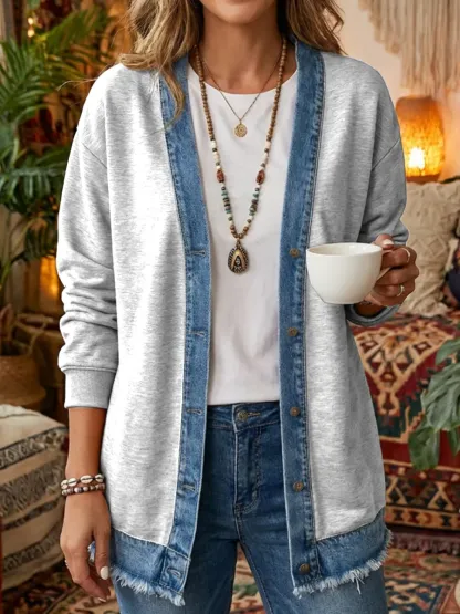 Women's Art Print Casual Long Sleeve Denim Patchwork Shirt Coat