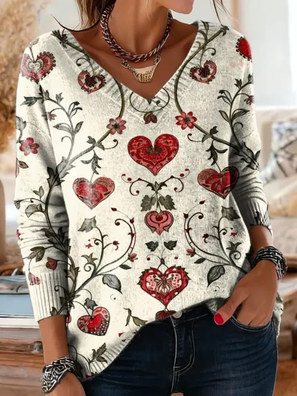 Women's Beige Heart Flower Art Print Casual V-neck Long Sleeve Knit Sweater