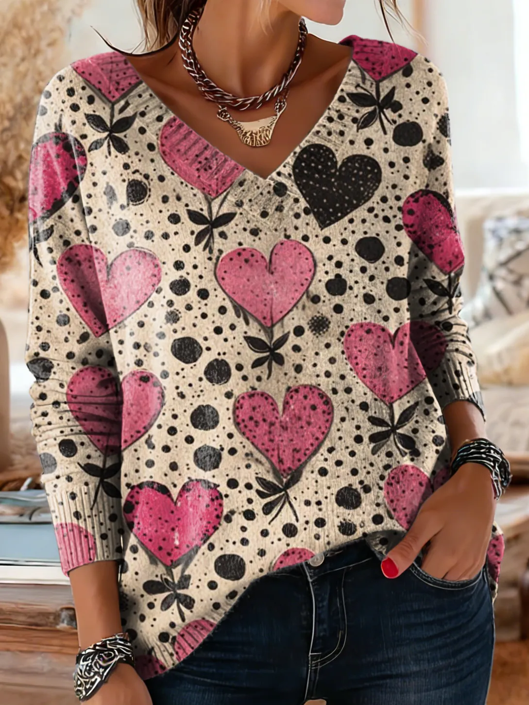 Women's Black Pink Polka Dot Heart Art Print Casual V-neck Long Sleeve Knit Sweater