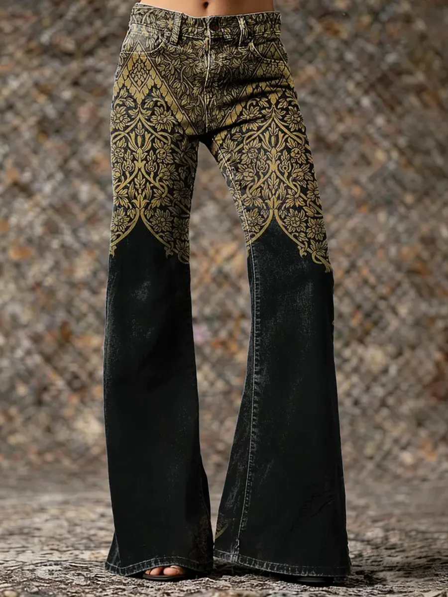 Women's Bohemian Ethnic Floral Art Print Washed Denim Jeans