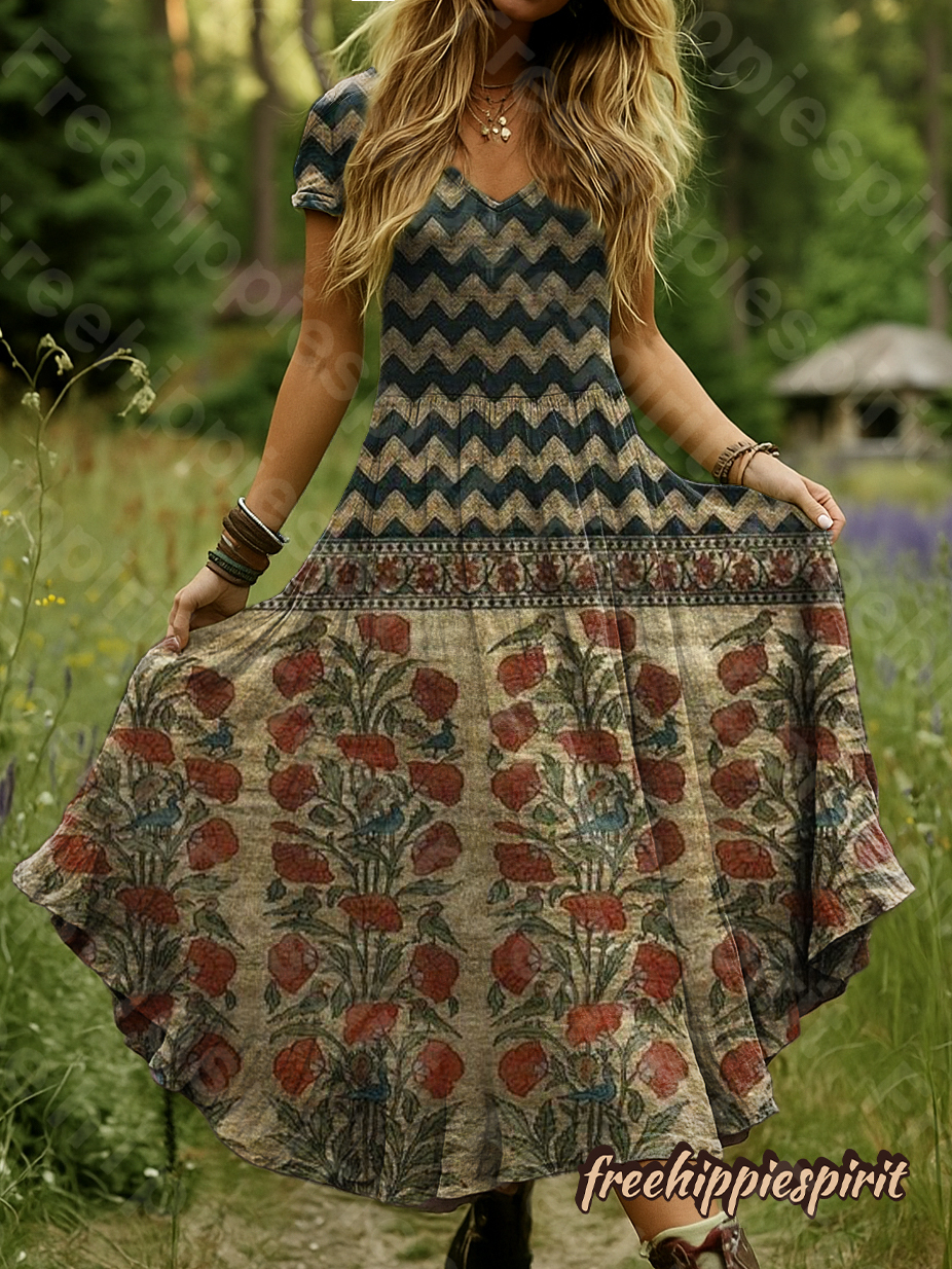 Women's Bohemian Floral Art Print Pocket Cotton Dress