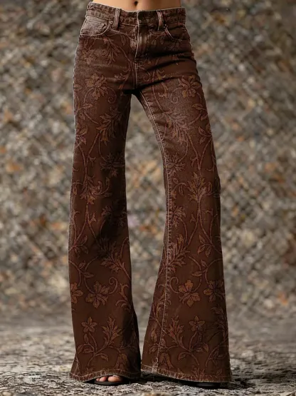 Women's Bohemian-style Textured Pattern Art Print Washed Denim Jeans