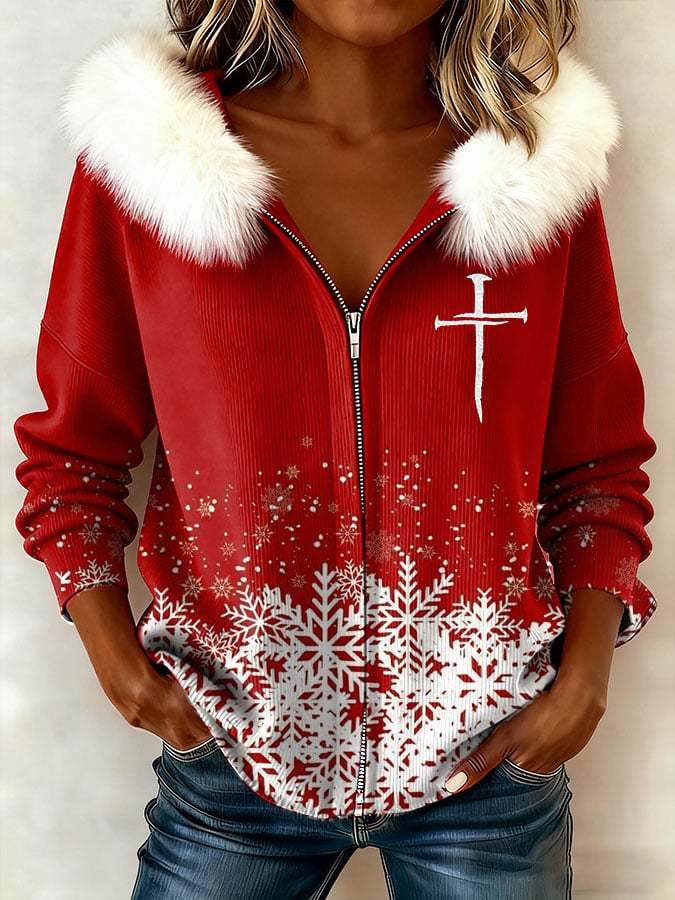 Women's Christmas Cross Print Patchwork Fur Collar Long-Sleeve Sweatshirt
