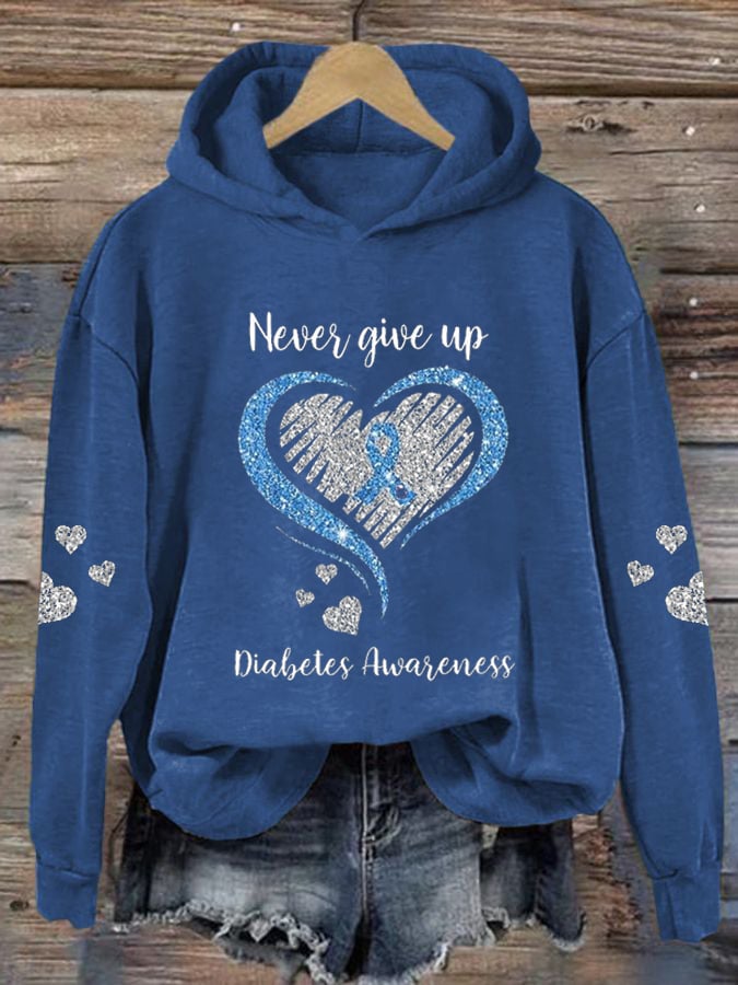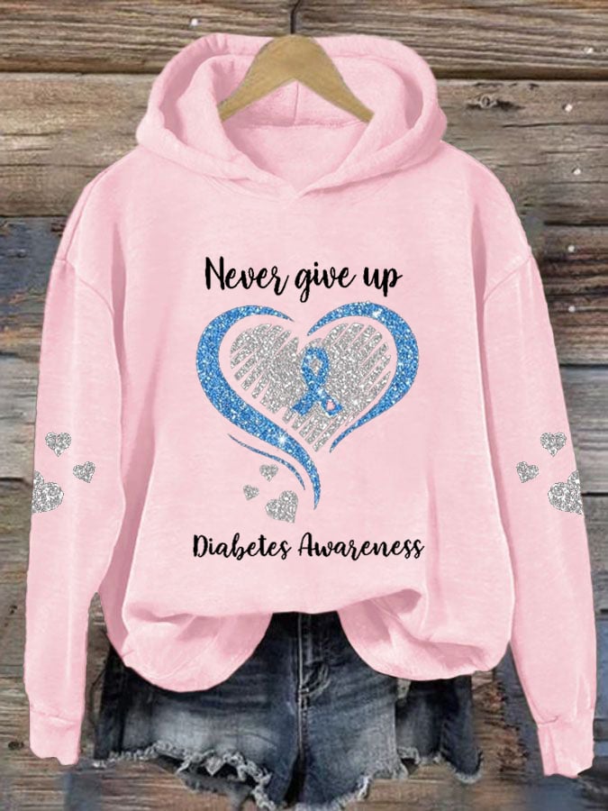 Women's Diabetes Awareness Never Give Up Print Hoodie Long Sleeve Sweatshirt