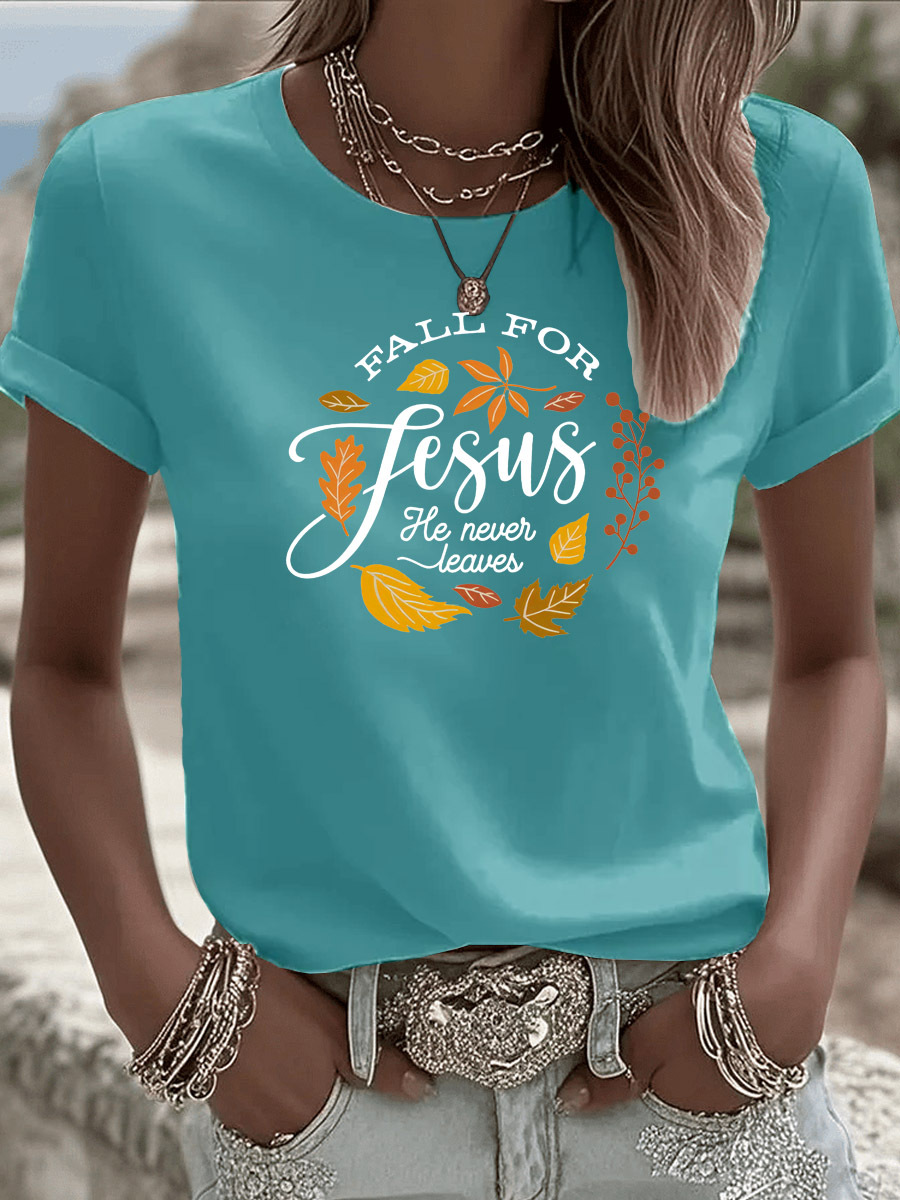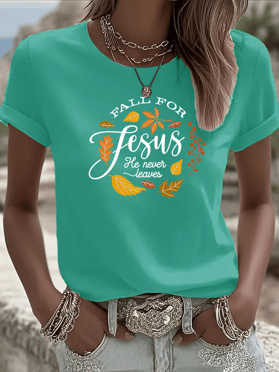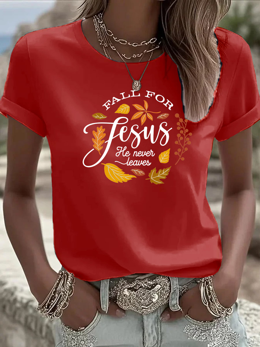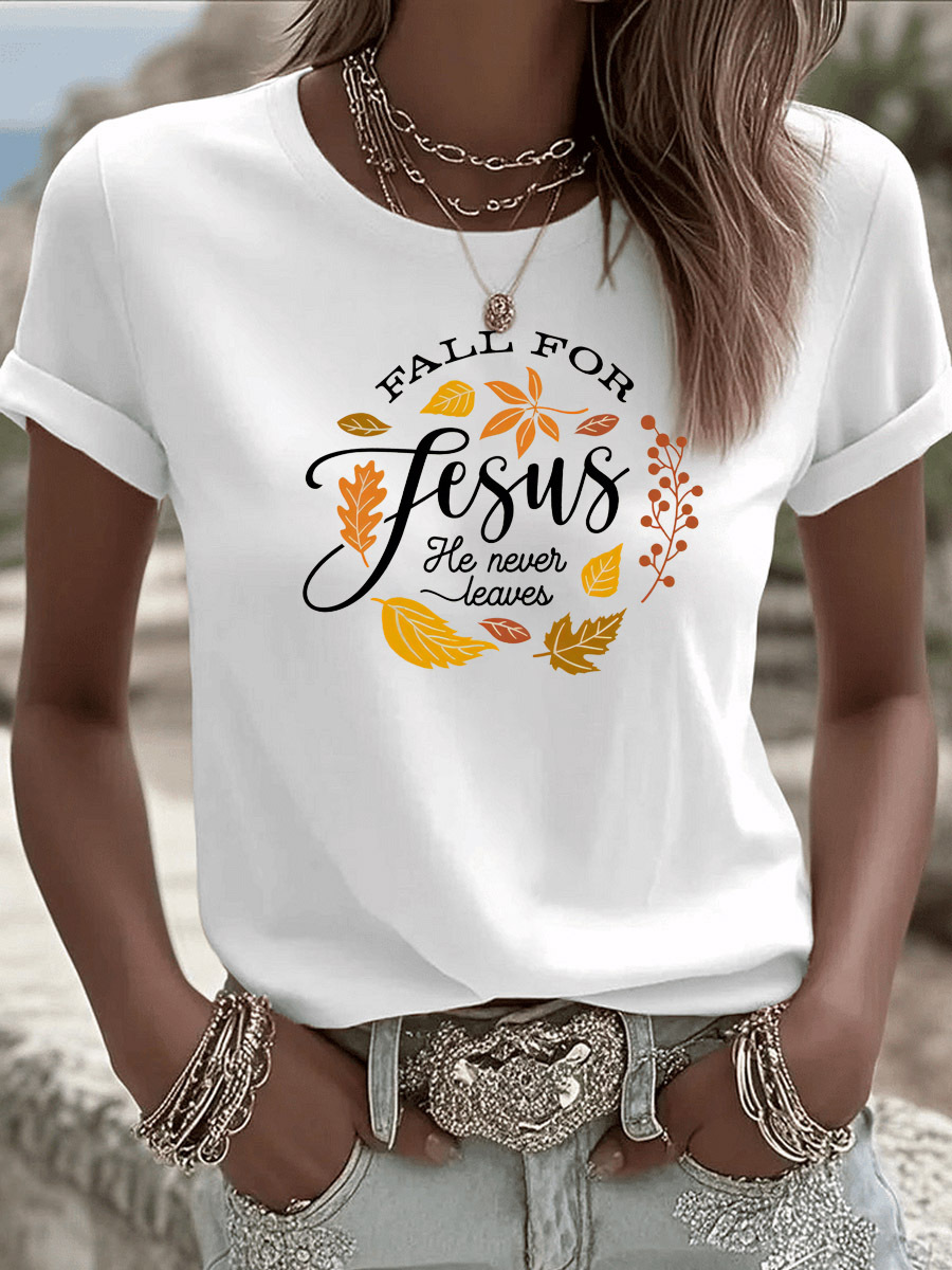 Women's Fall For Jesus He Never Leaves Pattern Round-Neck T-Shirt