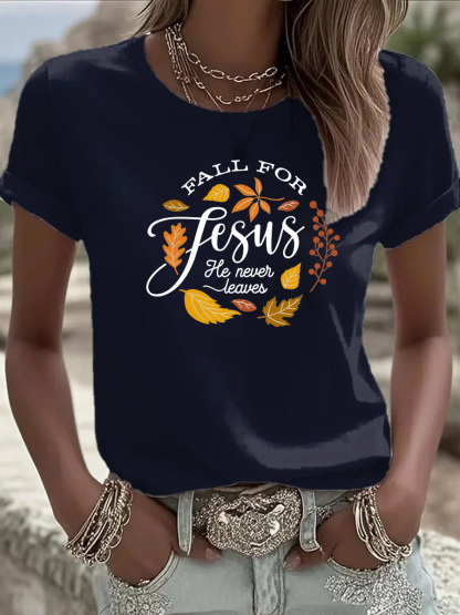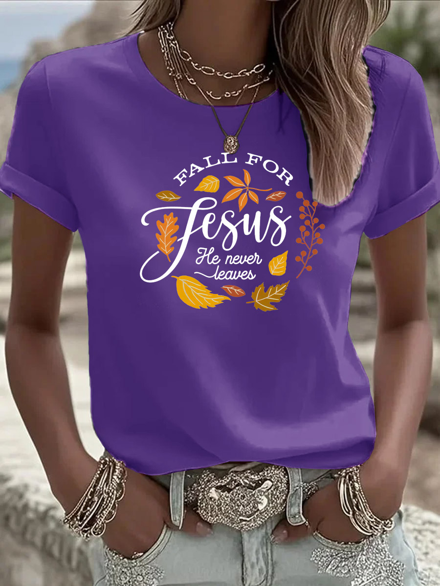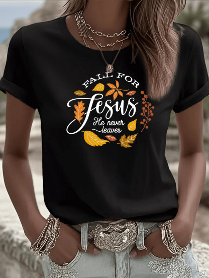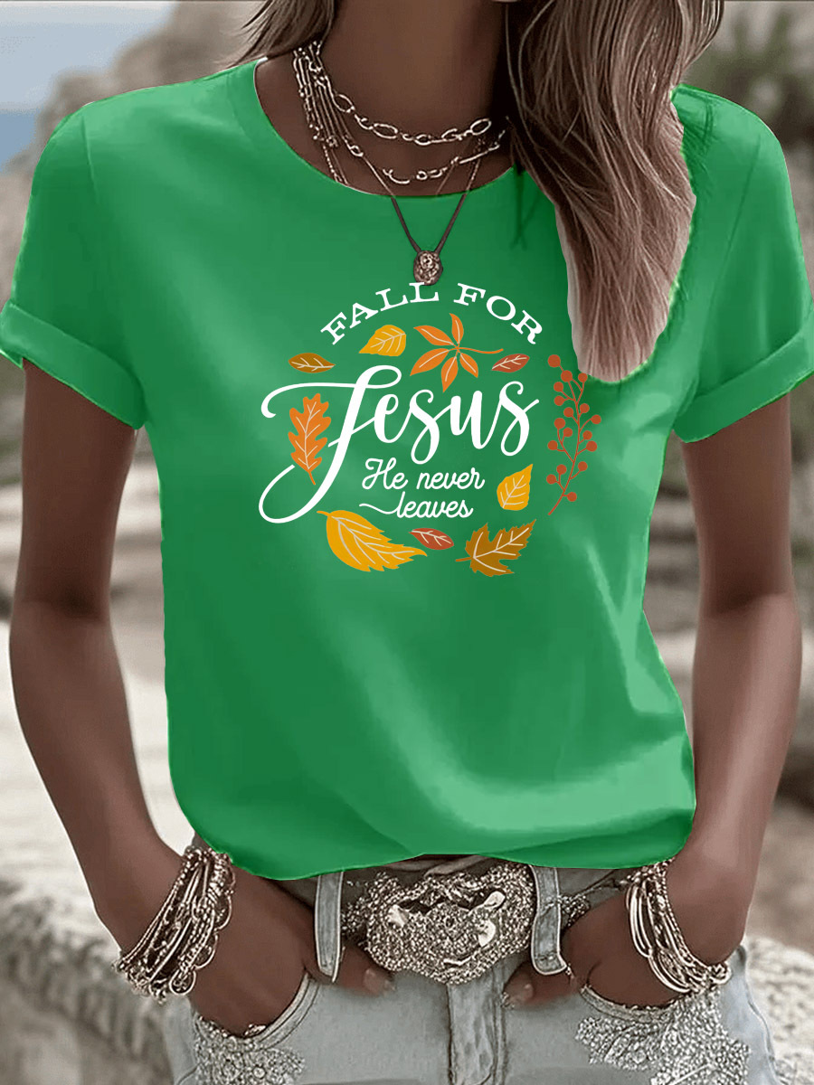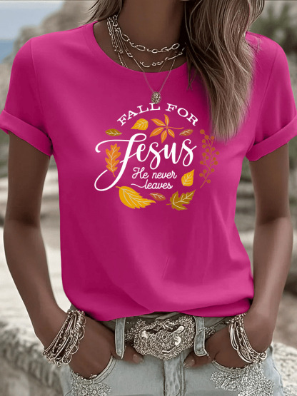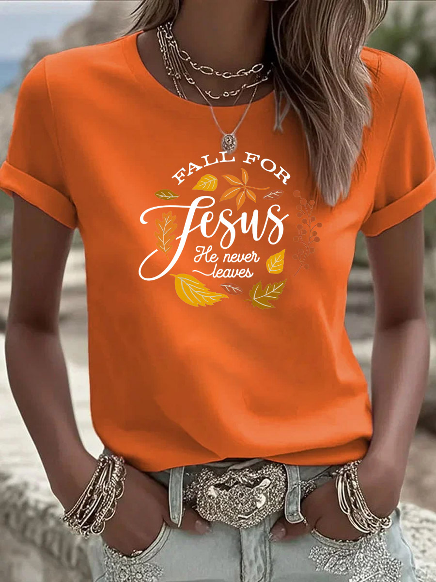 Women's Fall For Jesus He Never Leaves Pattern Round-Neck T-Shirt