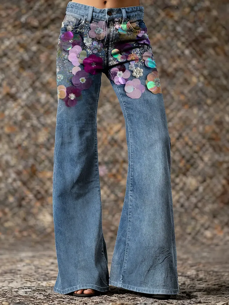 Women's Floral Petal Pattern Art Print Washed Denim Jeans