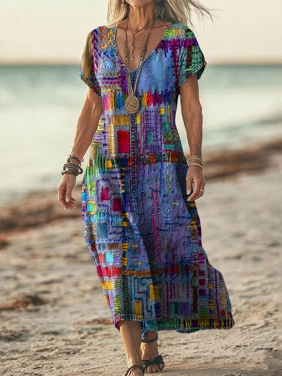 Women's Retro Colorful Art Print Casual Short-Sleeve V-Neck Washed Cotton Denim Dress