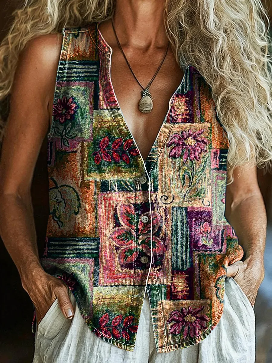 Women's Retro Colorful Floral Art Print Casual Washed Cotton Denim Tank