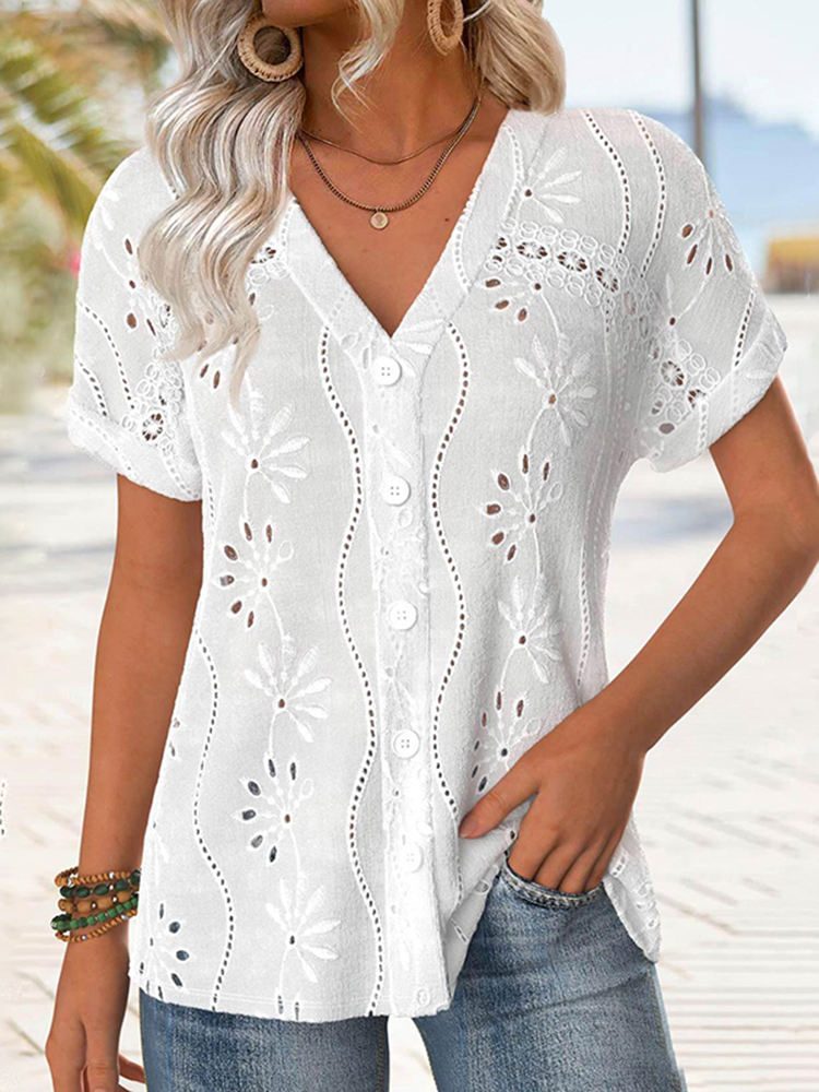 Women's Retro Floral Lace Embroidery Art V-neck T-shirt