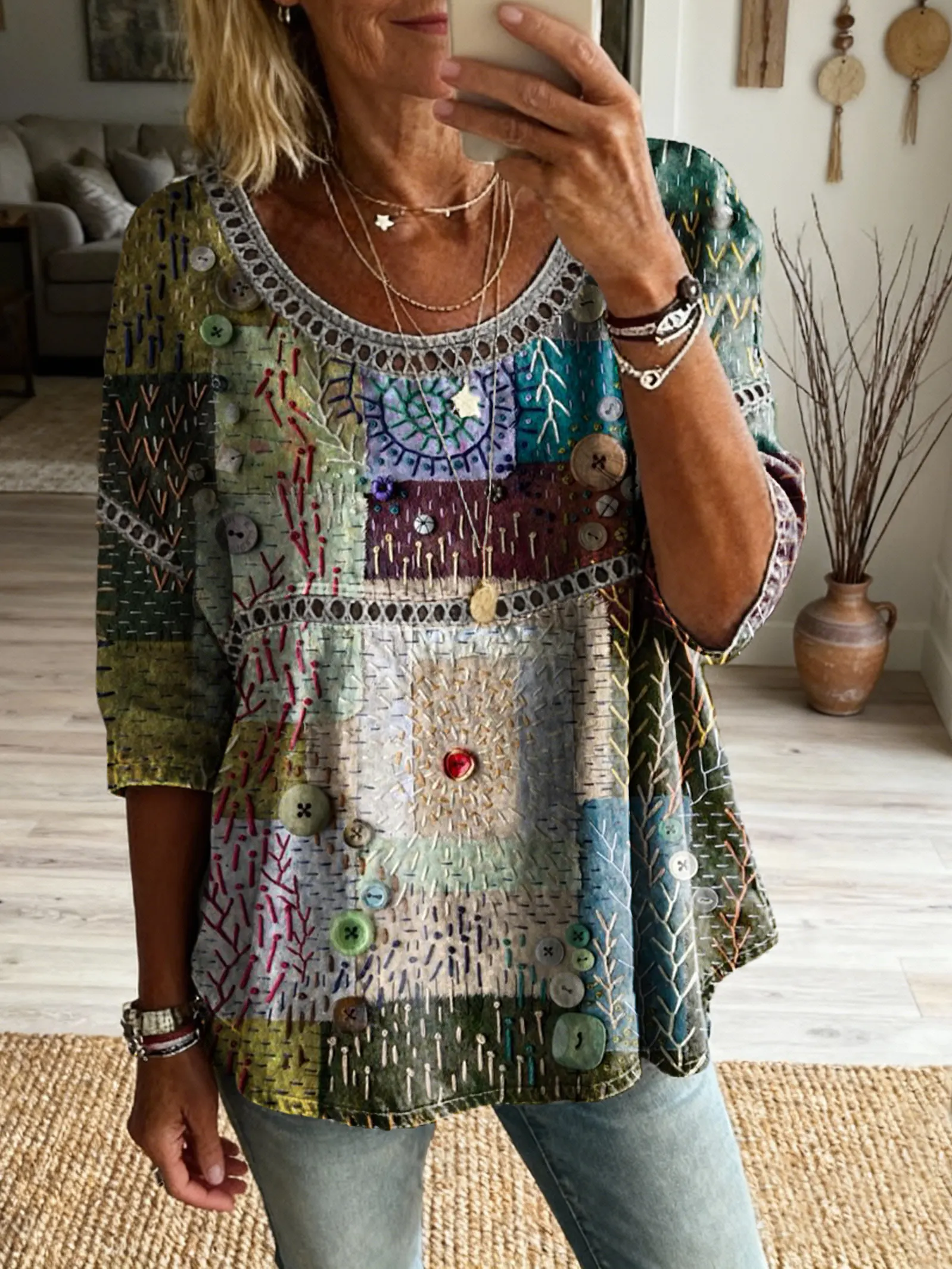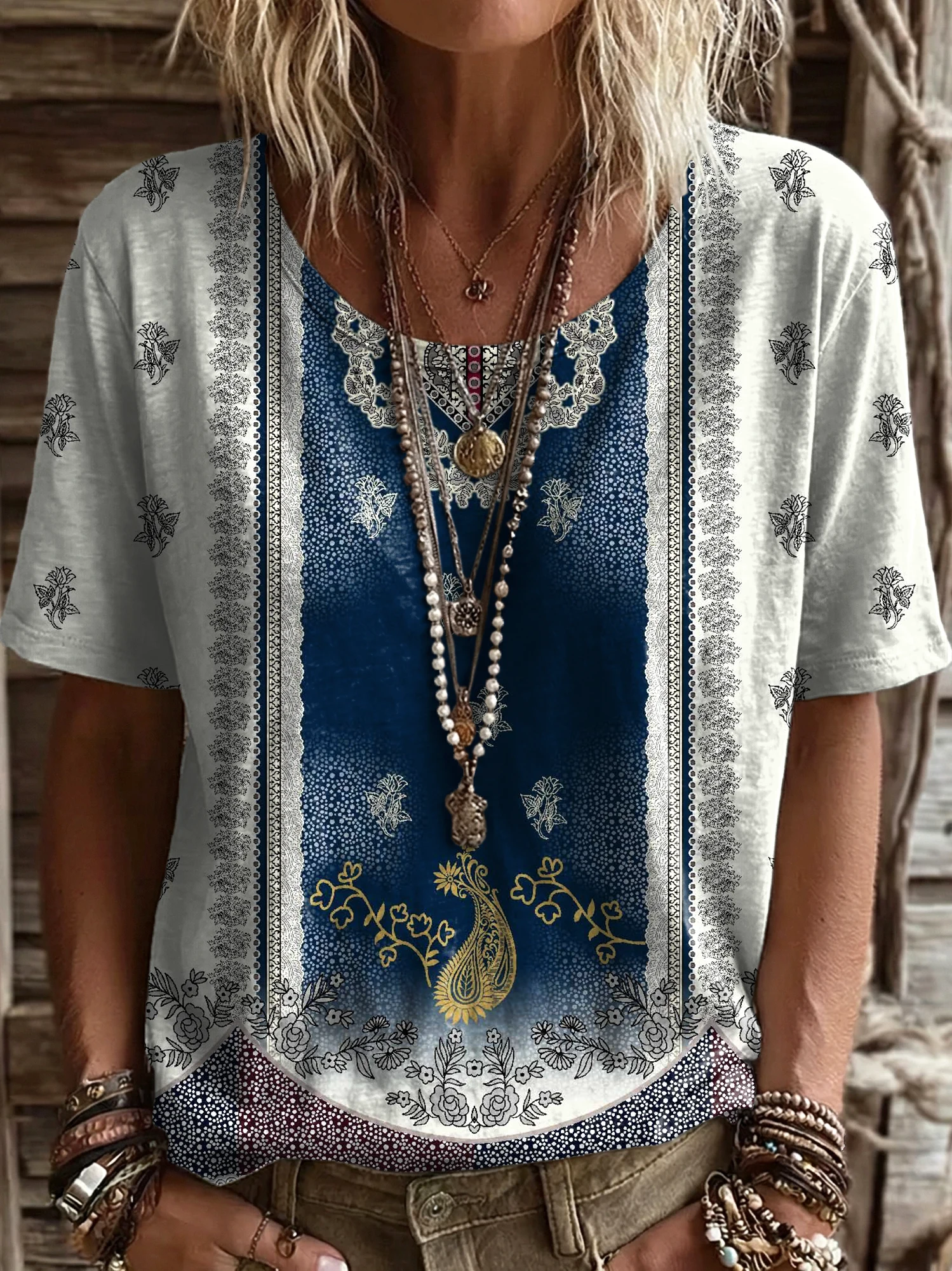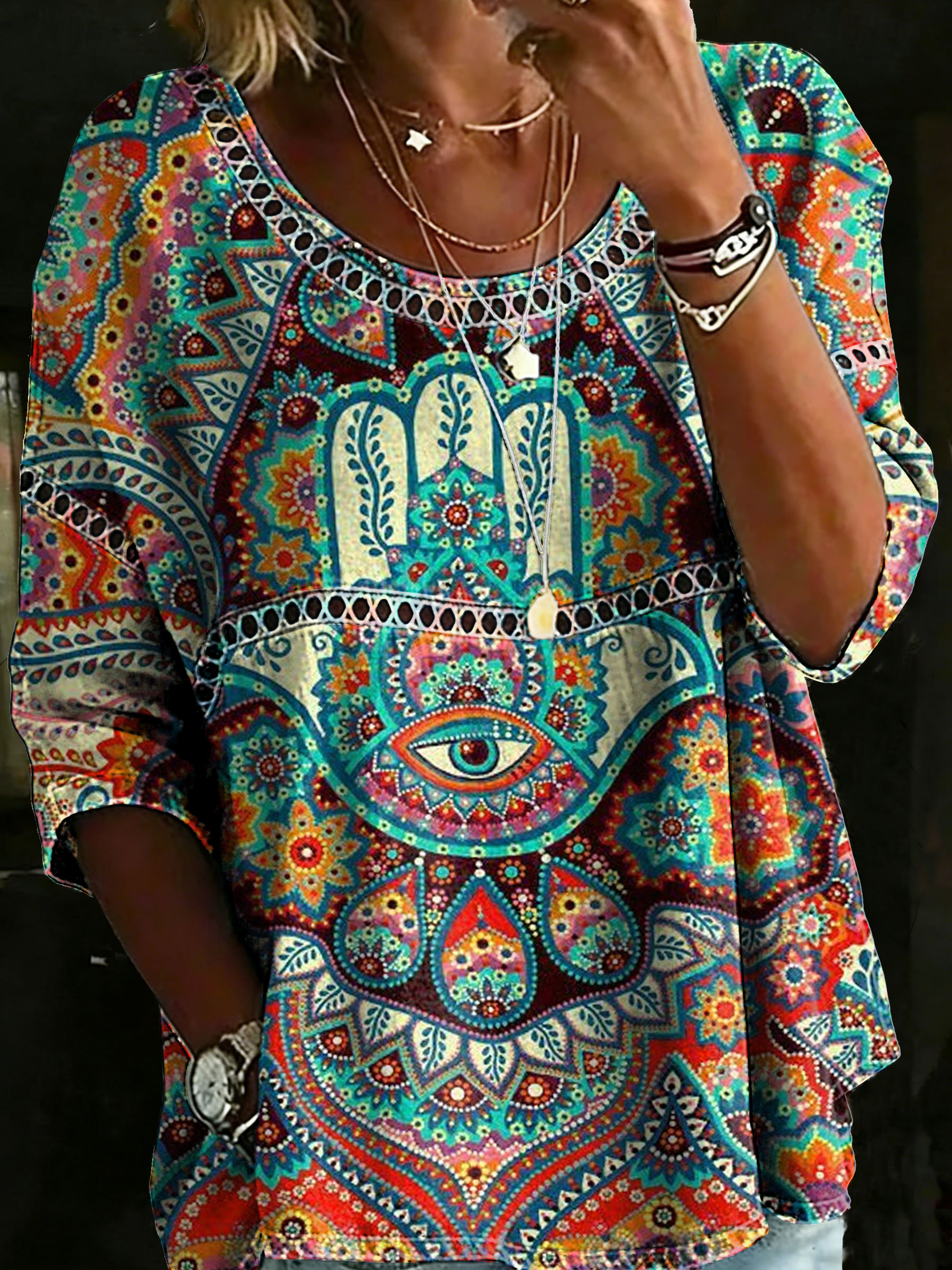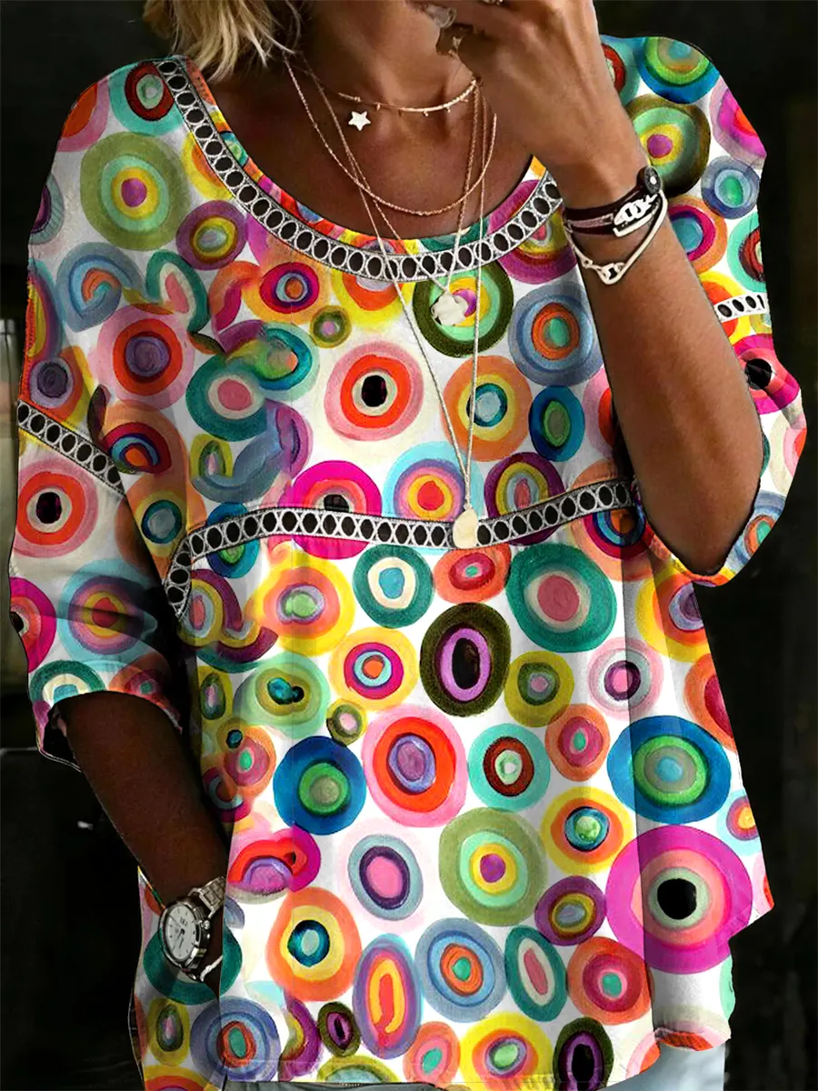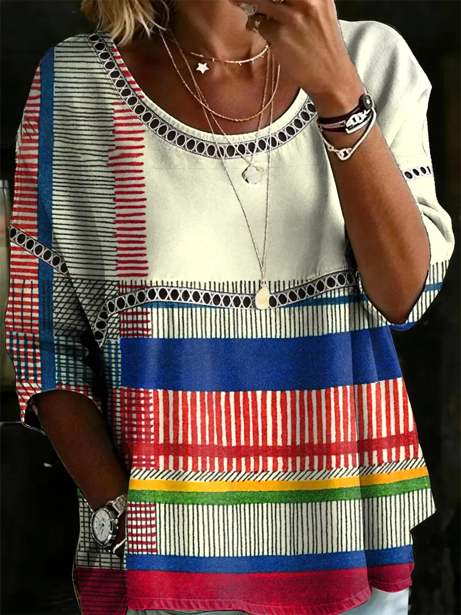 Women's Vintage Patchwork Textured Art Print Casual Round Neck Cutout Top