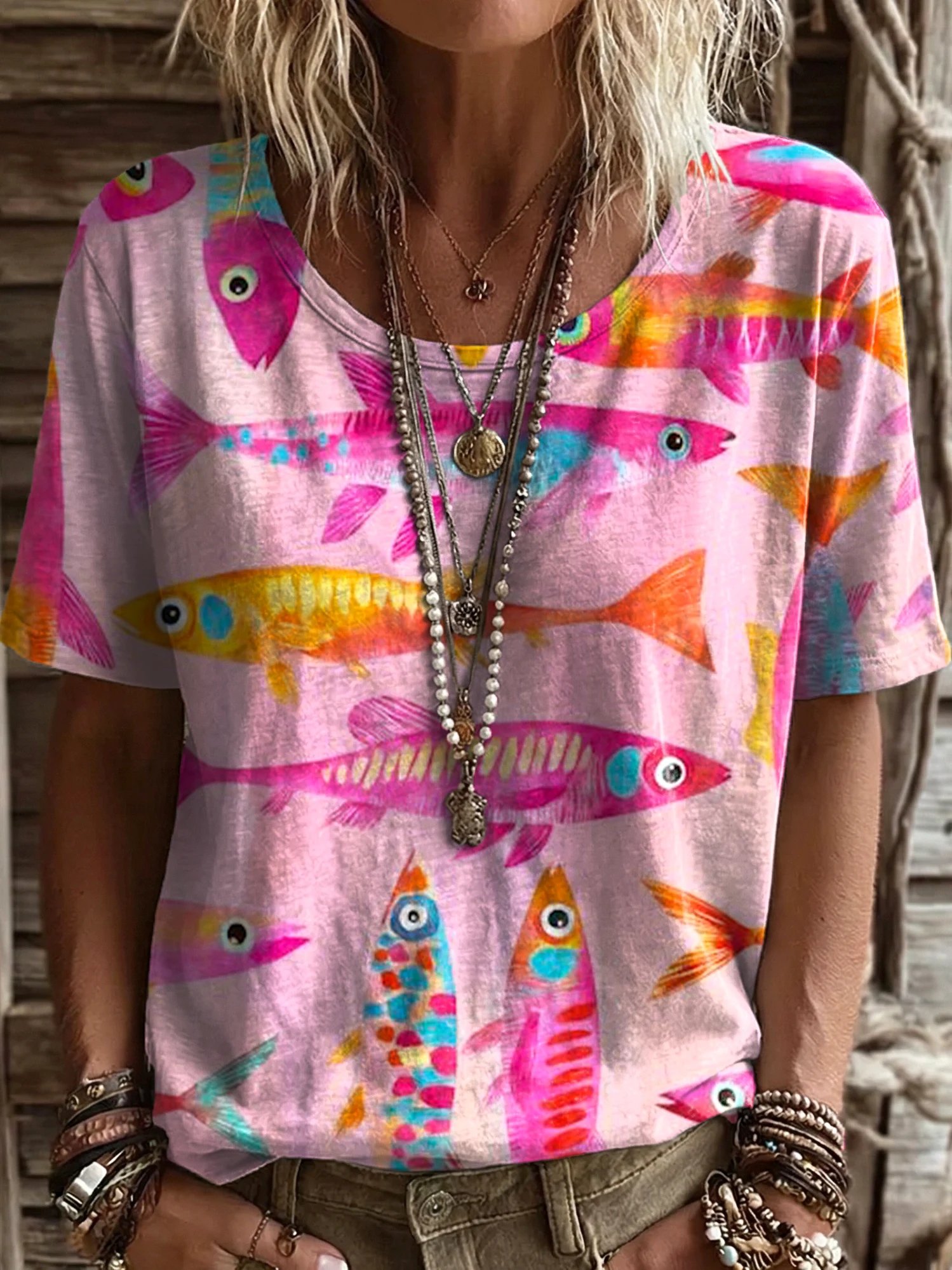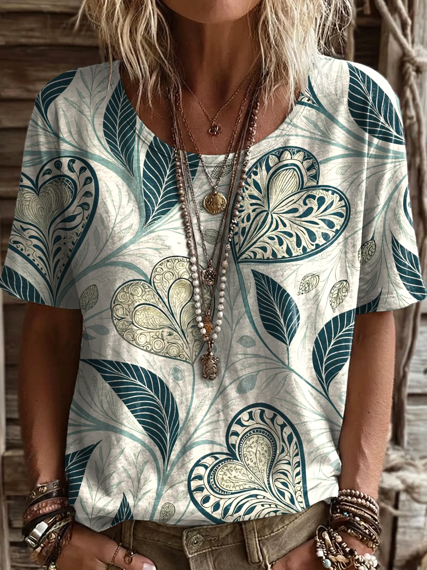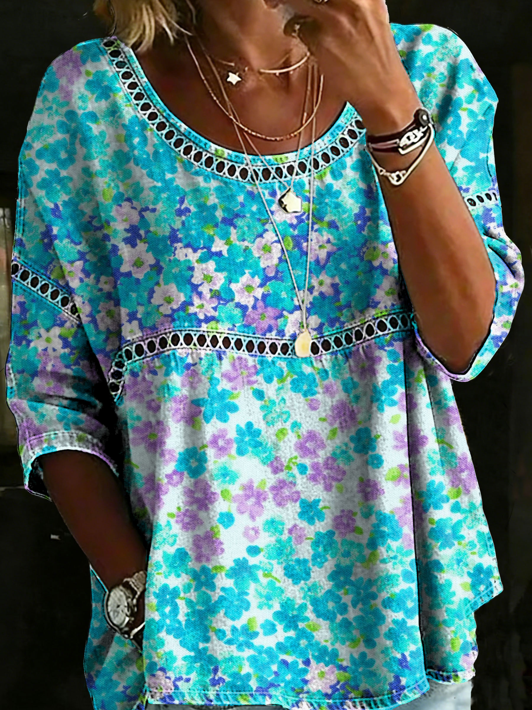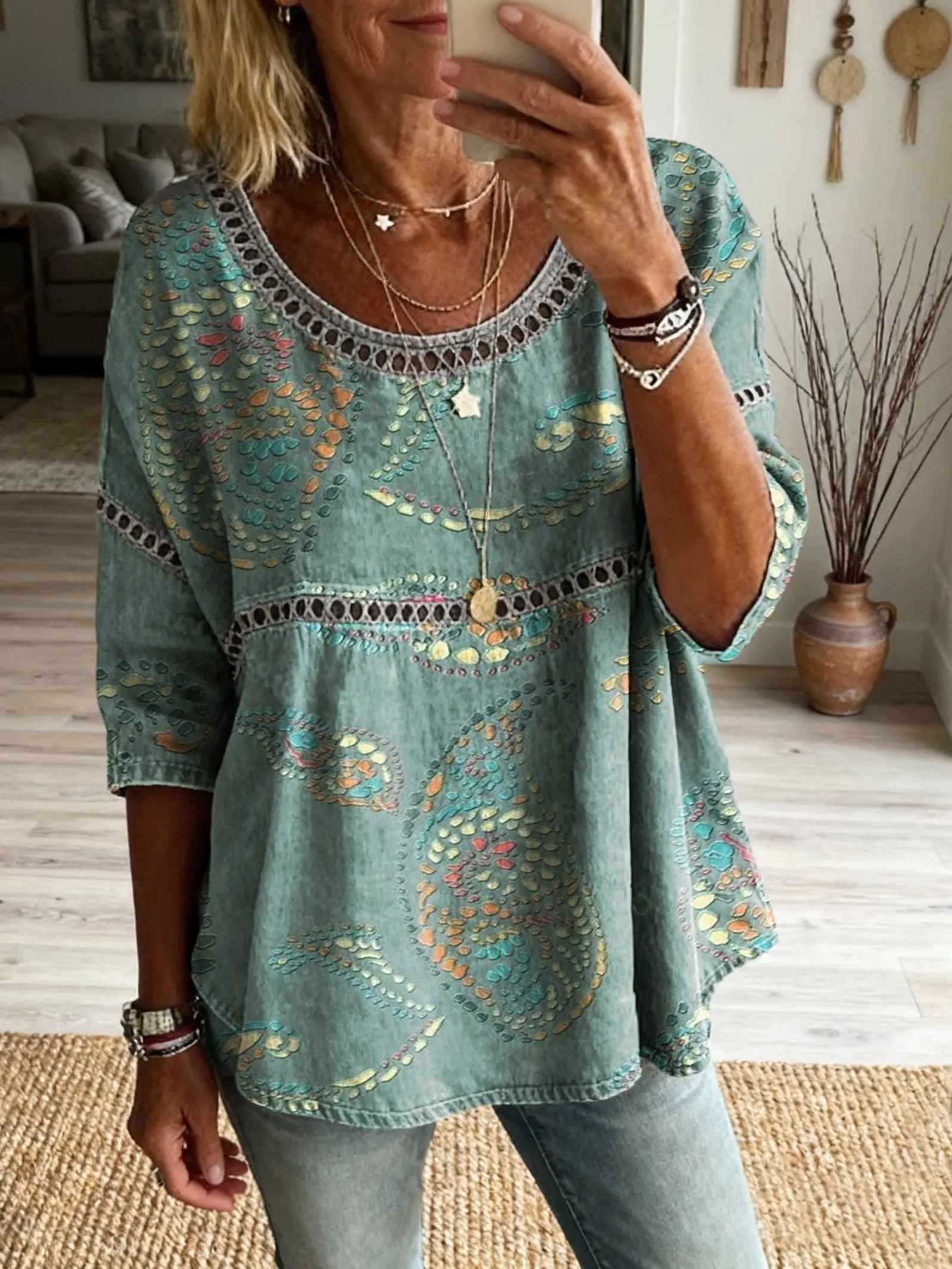 Women's Vintage Patchwork Textured Art Print Casual Round Neck Cutout Top