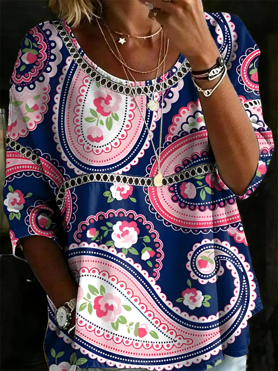 Women's Ethnic Paisley Art Print Round Neck Hollow-out Cotton Shirt
