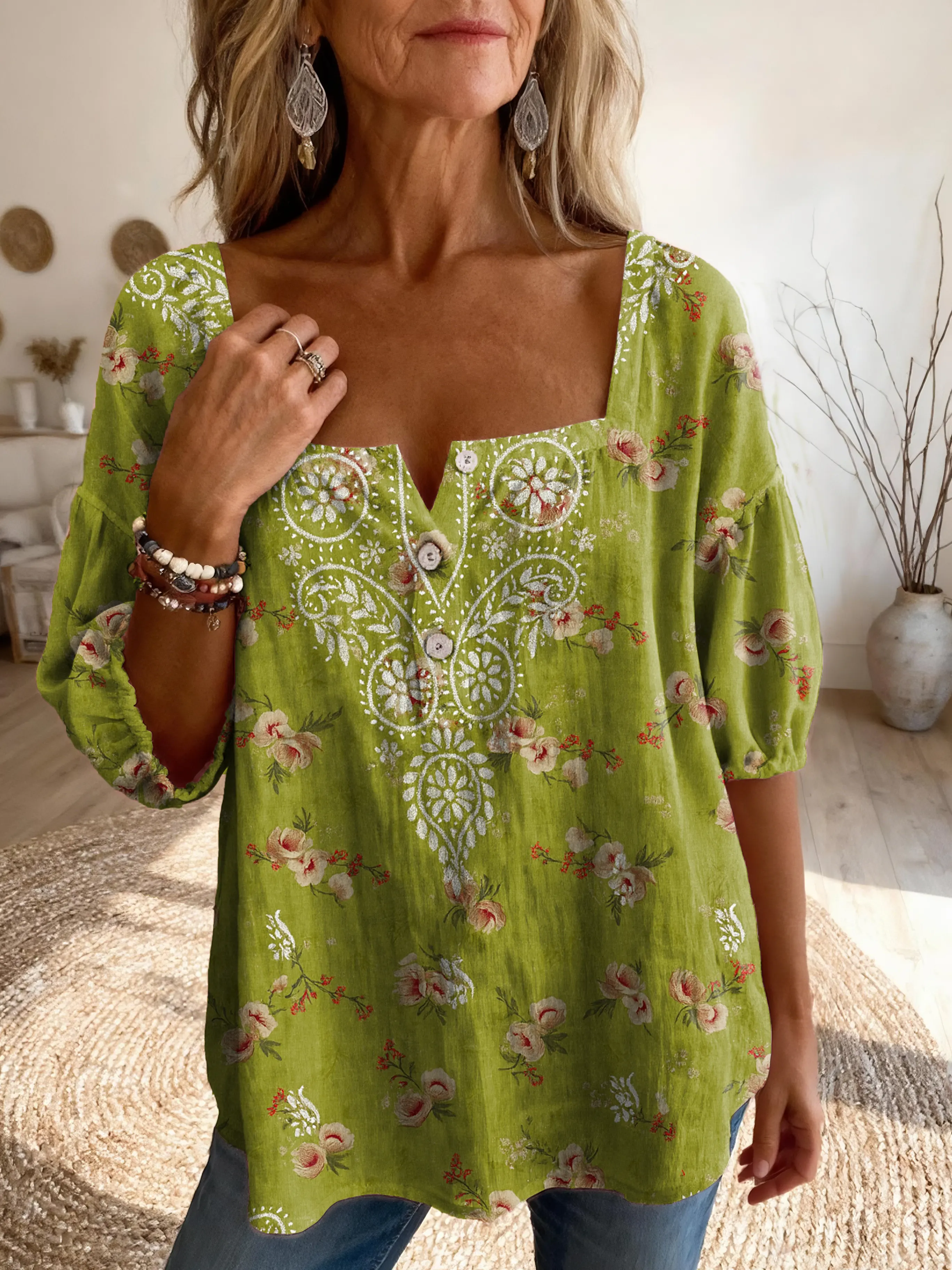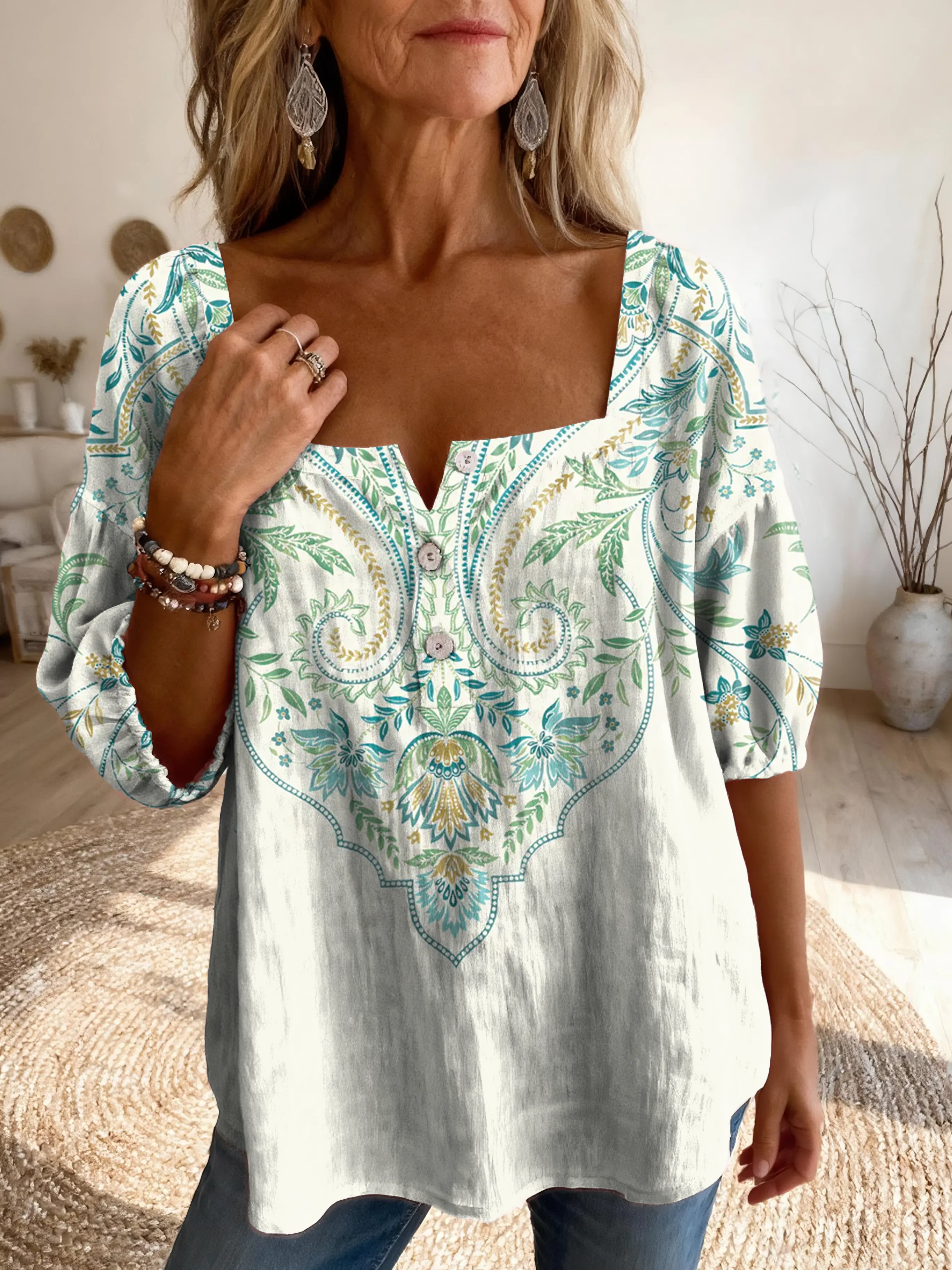 Ethnicity Green Flowers Geometry Women's Vintage Art Print Casual Square-neck Top