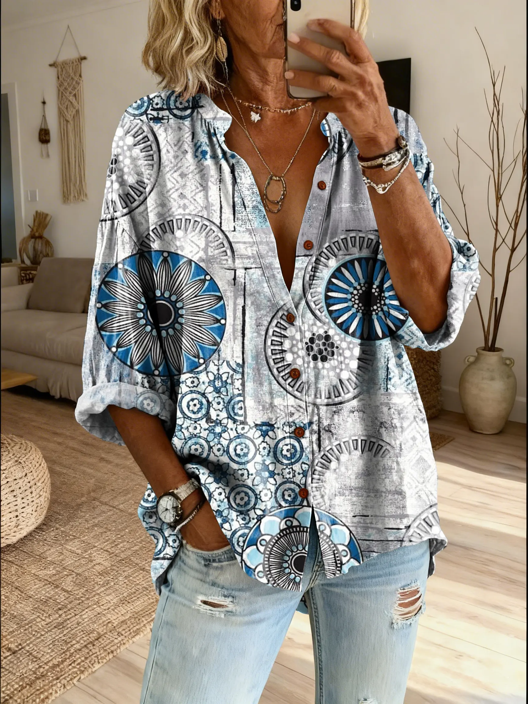 Women's Vintage Mandala Casual Loose Denim Blouse Shirt