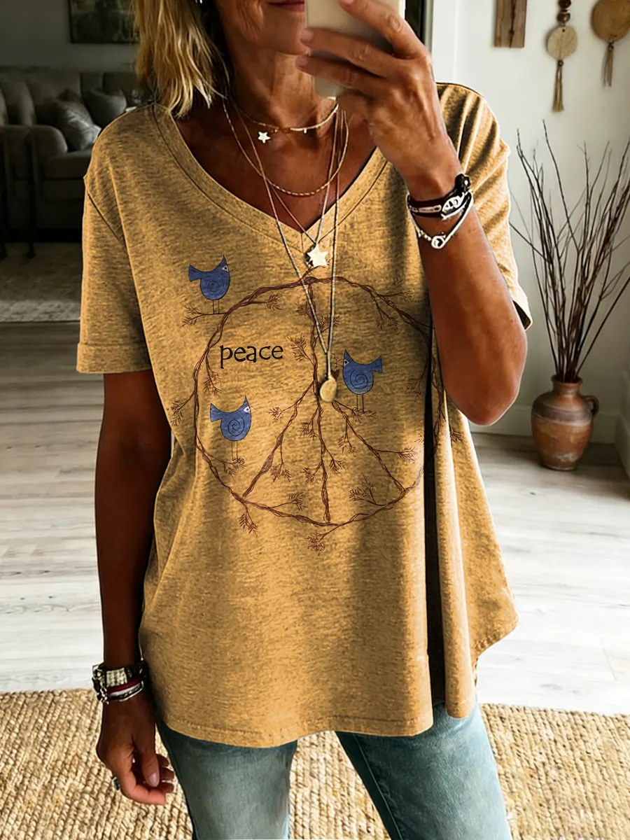 Hippie Peace Flowers Bird Women's V-neck Print Casual T-shirt