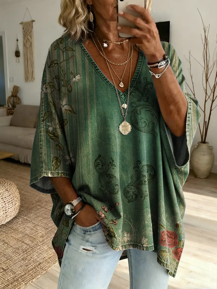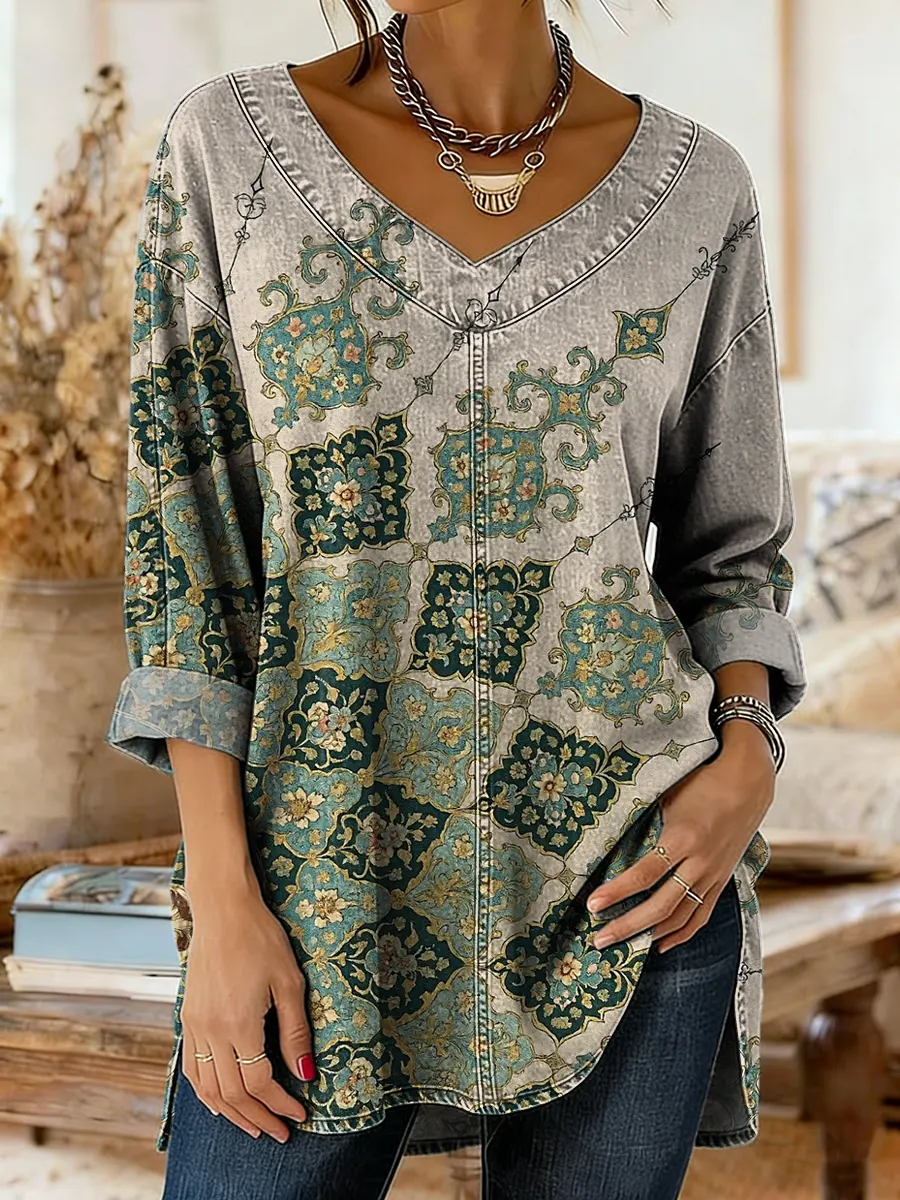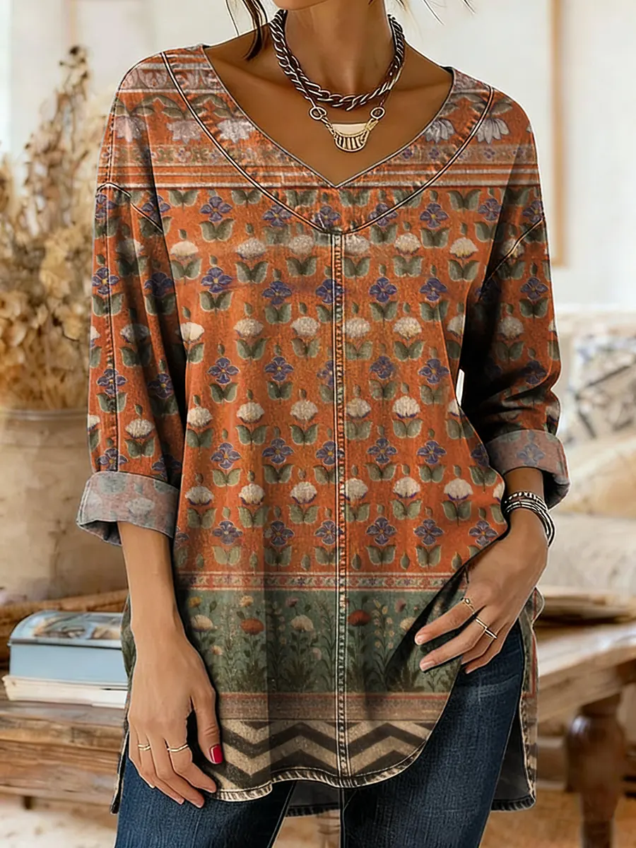 Women's Retro Ethnic Floral Art Print Casual V-neck Top
