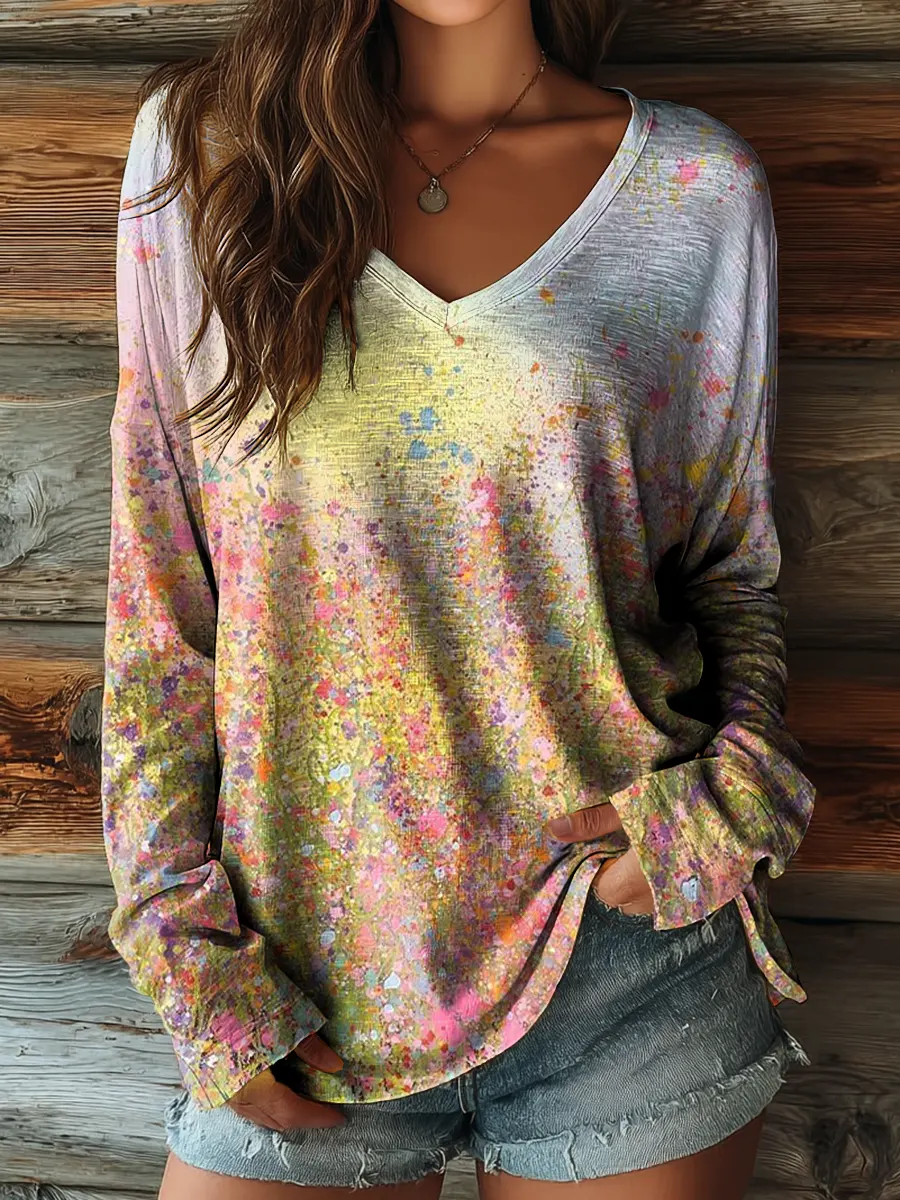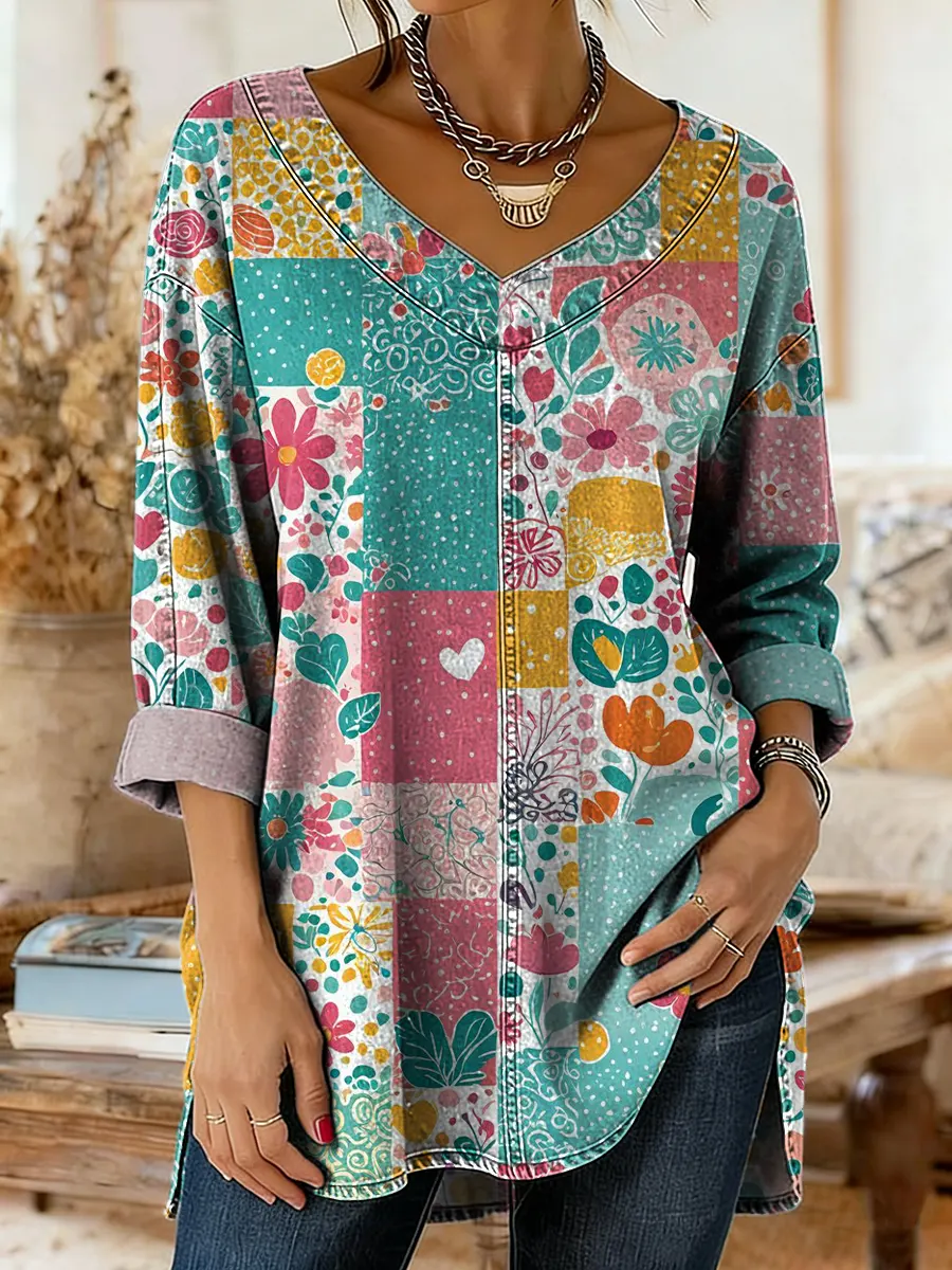Women's Colorful Vintage Floral Art Print Casual V-neck Long-sleeved T-shirt