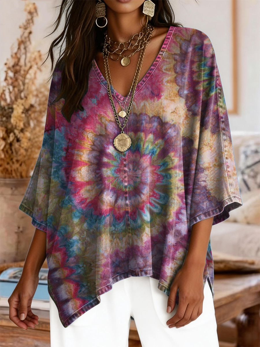Women's Retro Colorful Tie-dye Art Print Casual V-neck Top