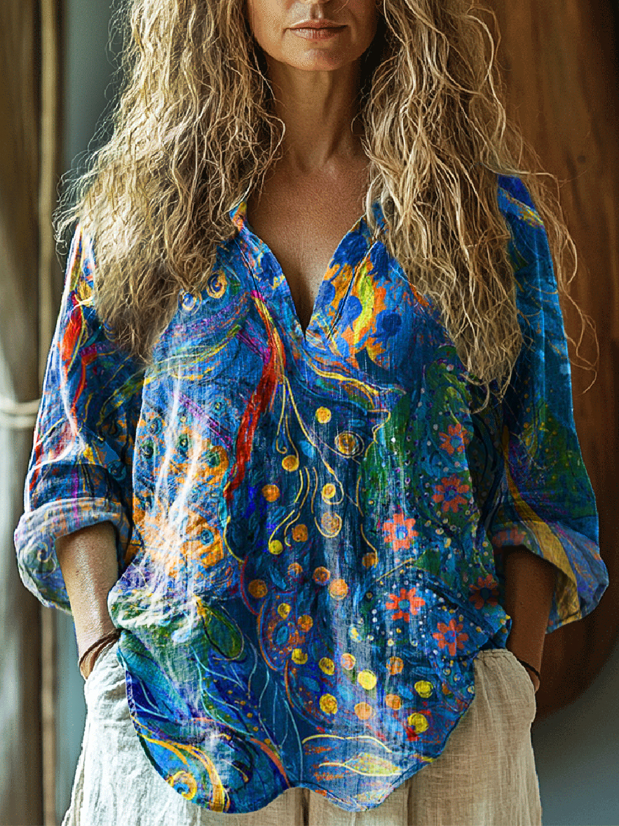 Women's Bohemian Floral Art Print Casual Cotton Linen Shirt