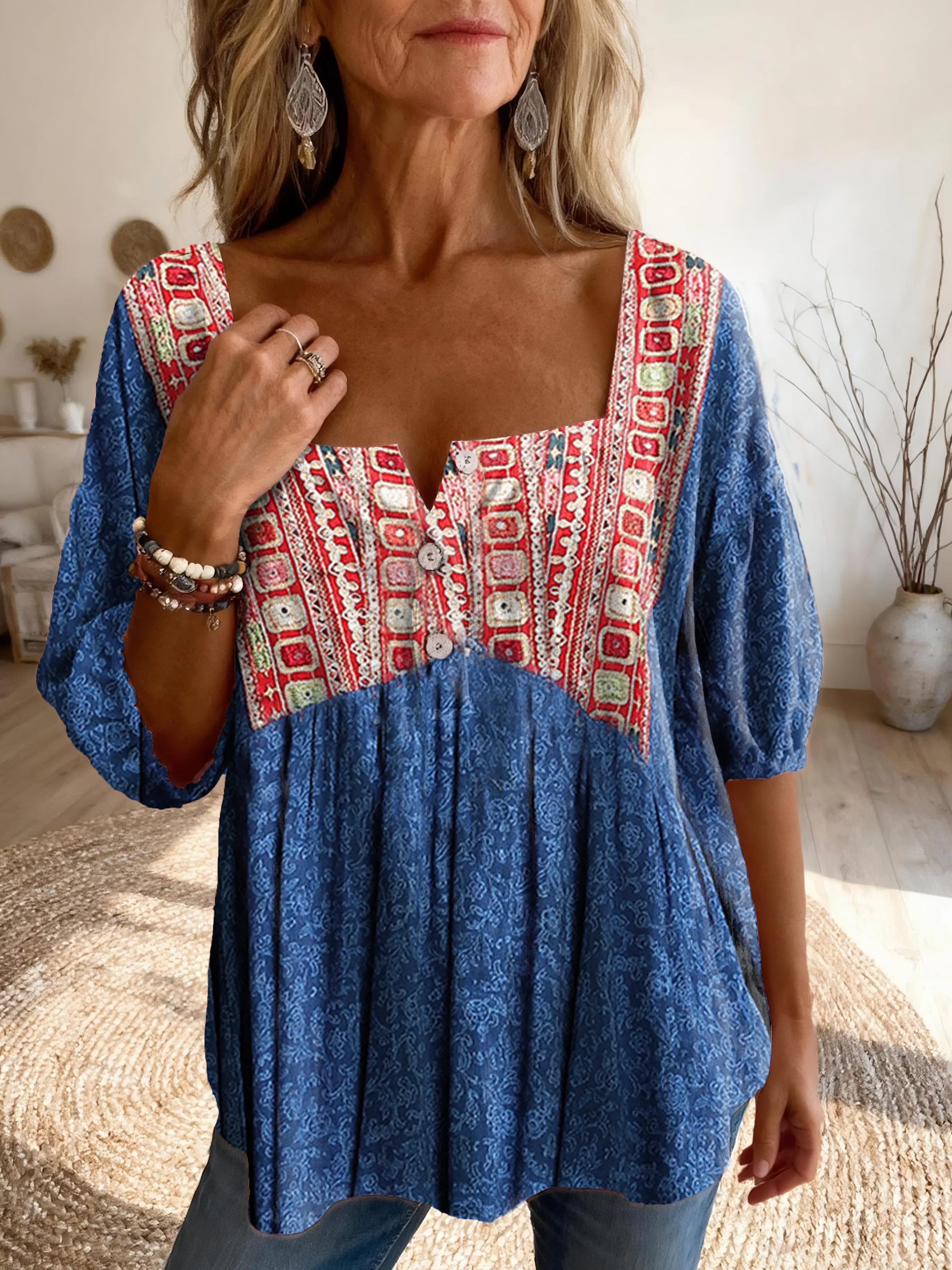 Ethnicity Totem Patchwork Women's Vintage Art Print Casual Square-neck Top