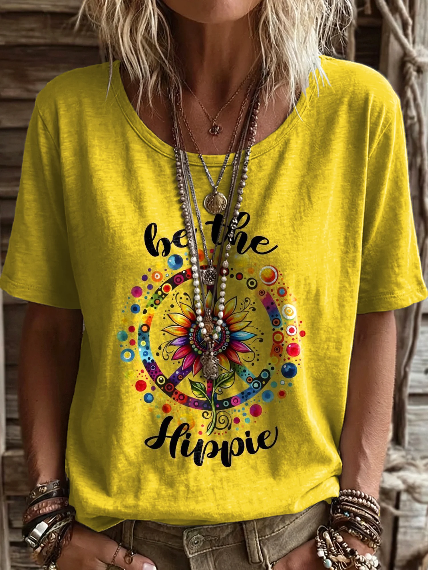 Women's Peace Symbol Sunflower Be The Hippie Art Print Casual Crew Neck Short Sleeve Cotton T-shirt