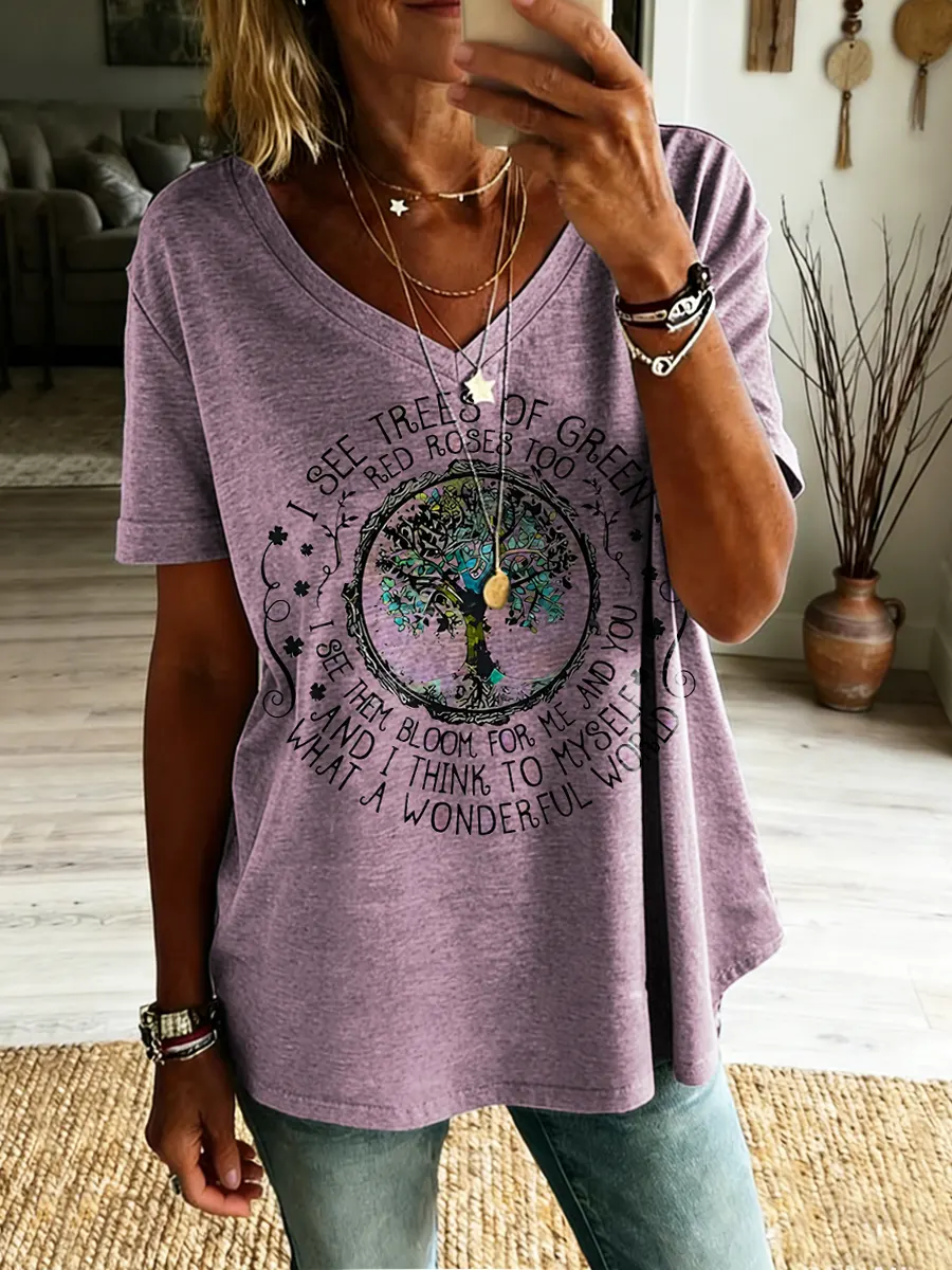 Trees Of Green Wonderful World Hippie Women's V-neck Print Casual T-shirt