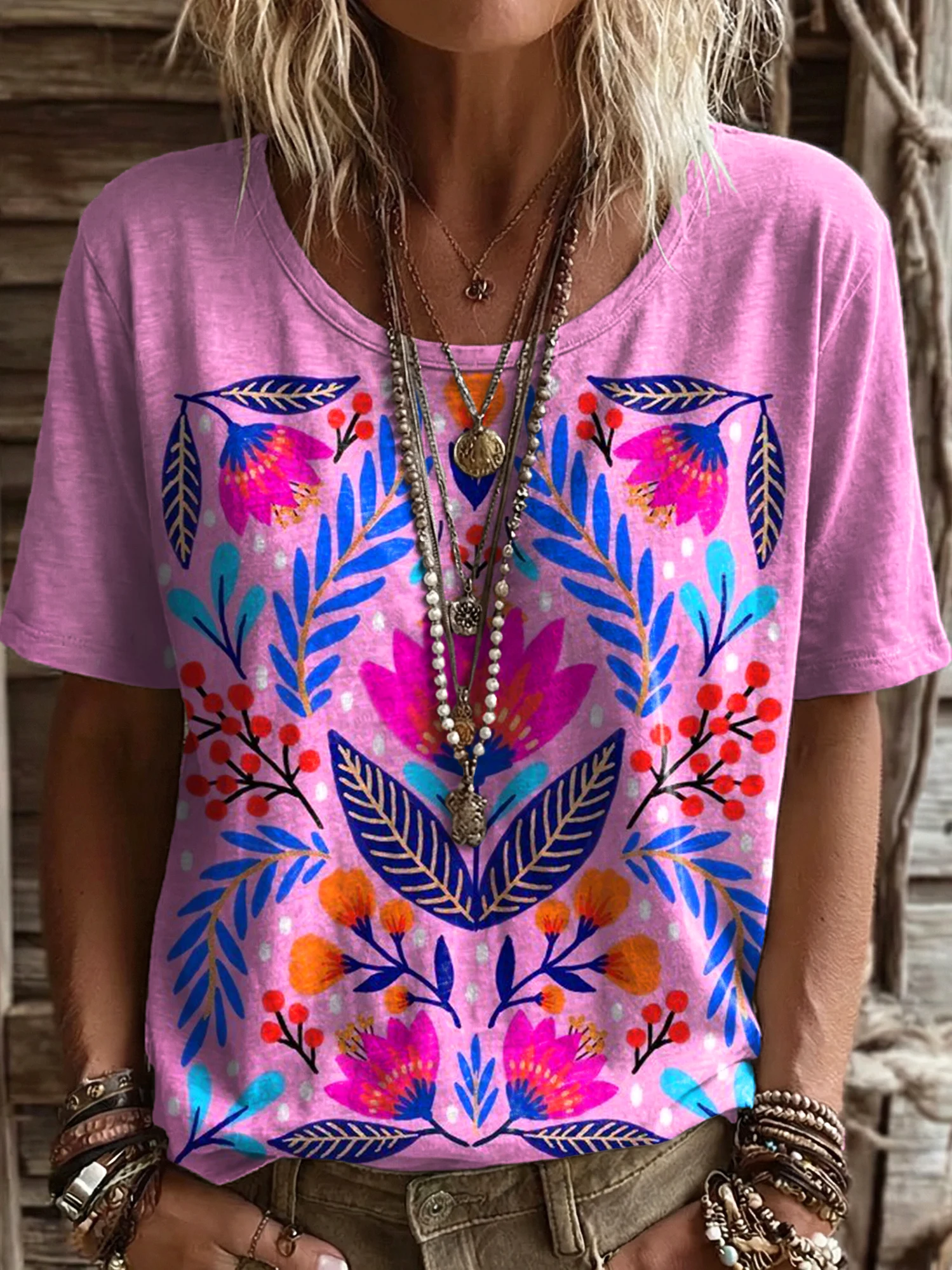 Women's Pink Ethnic Floral Art Print Casual Crew Neck Short Sleeve Cotton T-shirt