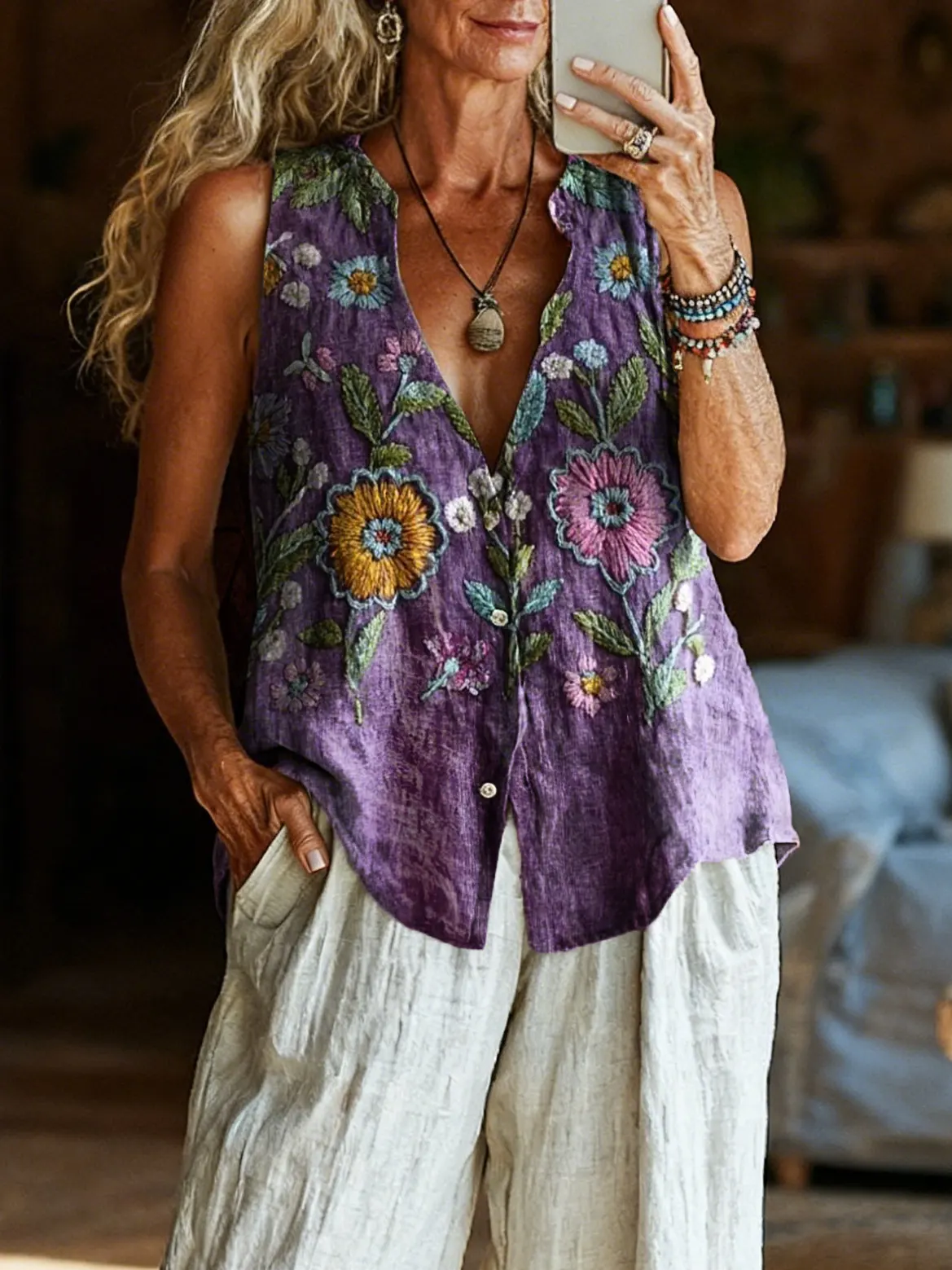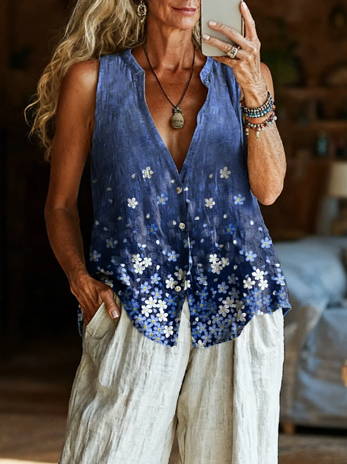 Women's Bohemian Textured Floral Art Print Sleeveless Cotton Shirt