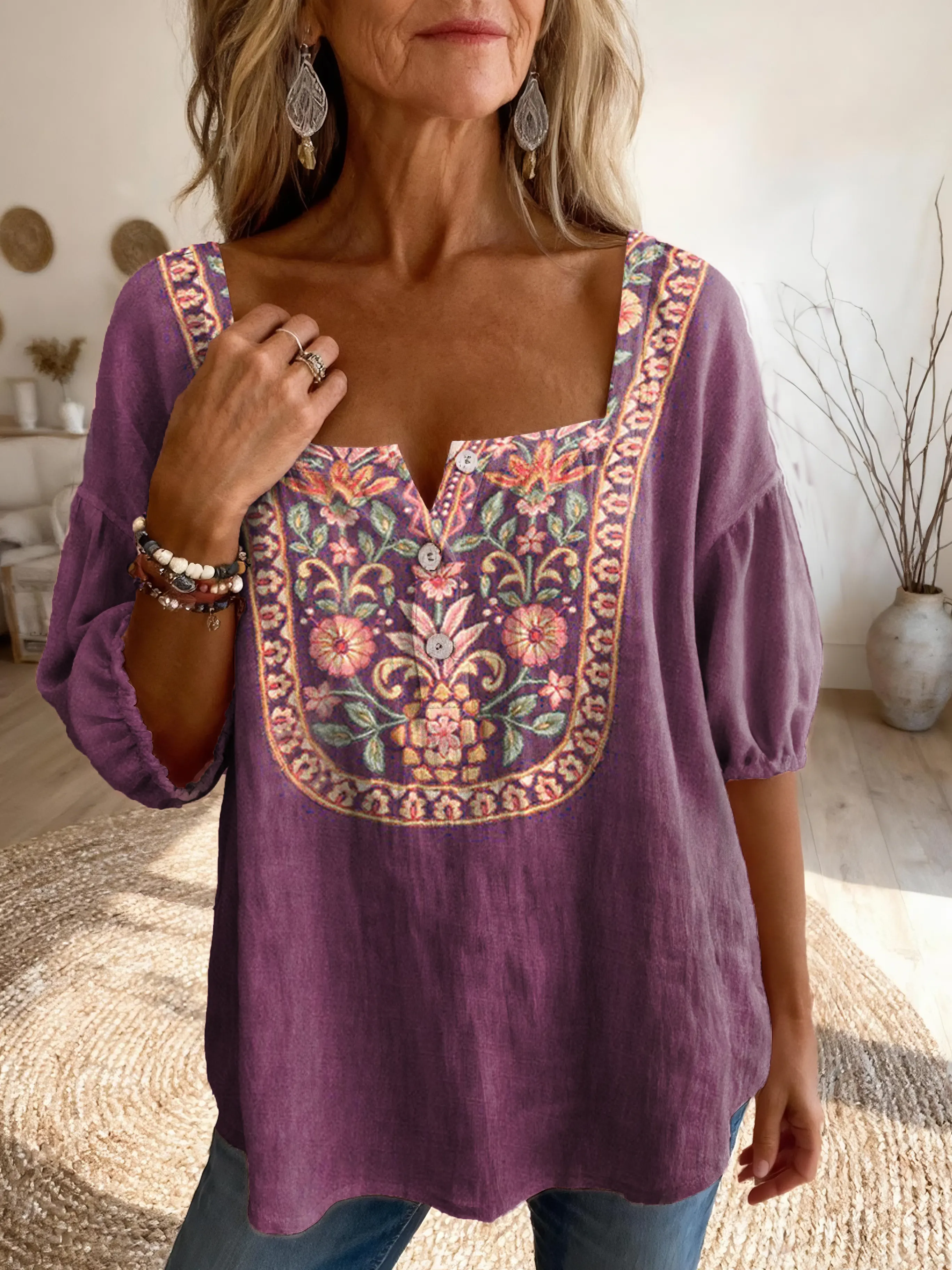 Ethnicity Flowers Totem Women's Vintage Art Print Casual Square-neck Top