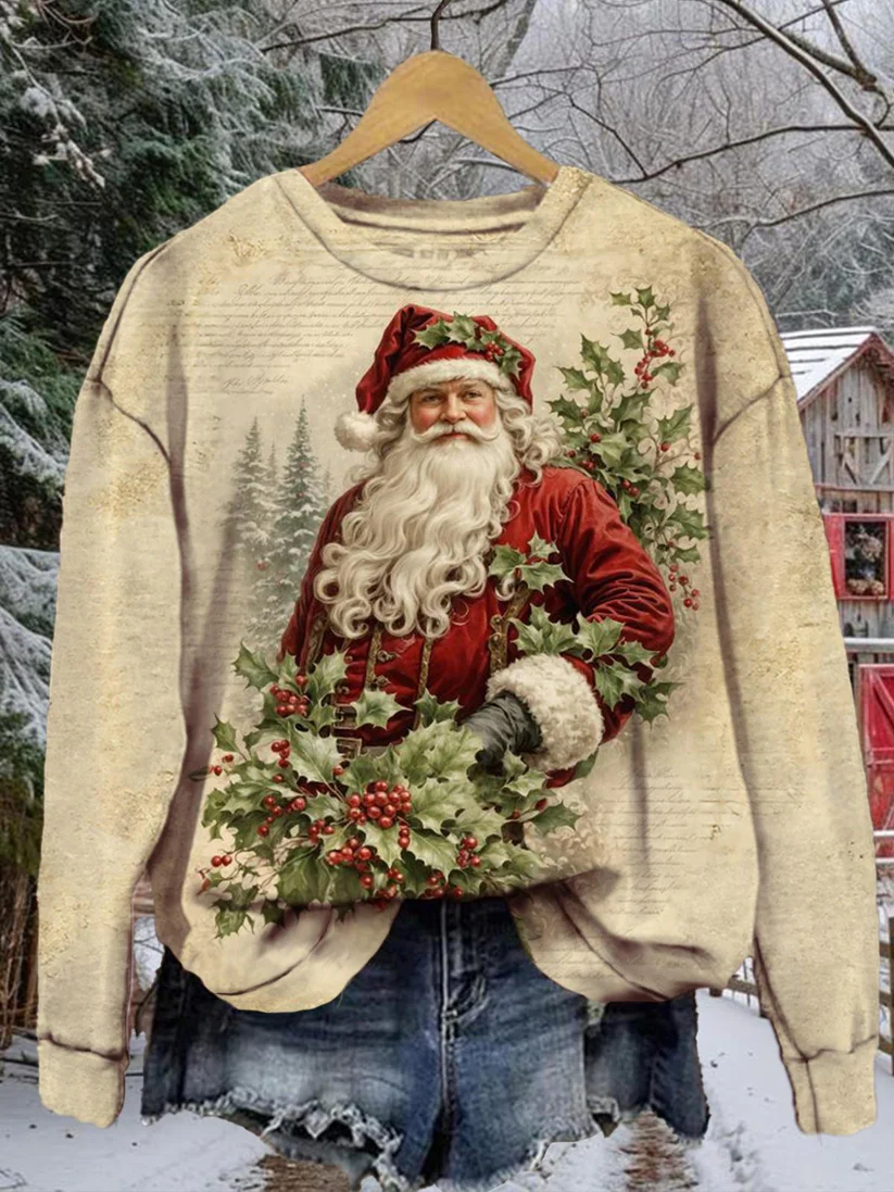 Women's Christmas Santa Pattern Art Print Casual Cotton Sweatshirt
