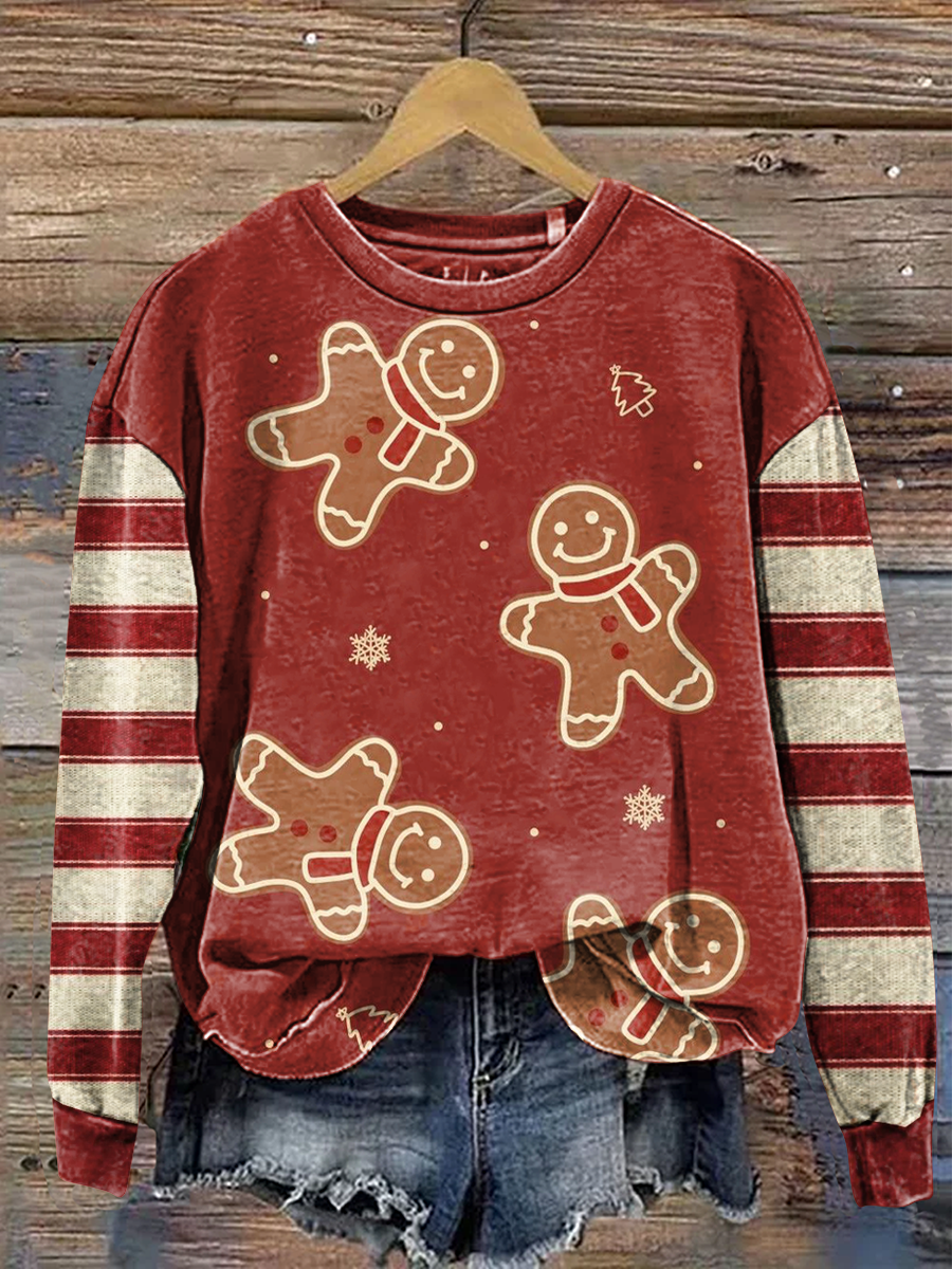 Christmas Striped Gingerbread Man Casual Cotton Sweatshirt