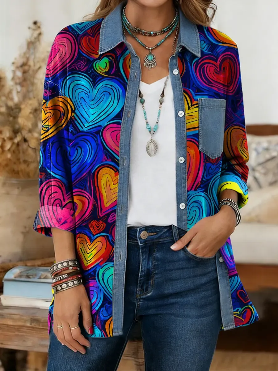 Ethnicity Colorful Abstract Love Women's Print Casual Denim Patchwork Cotton Shirt