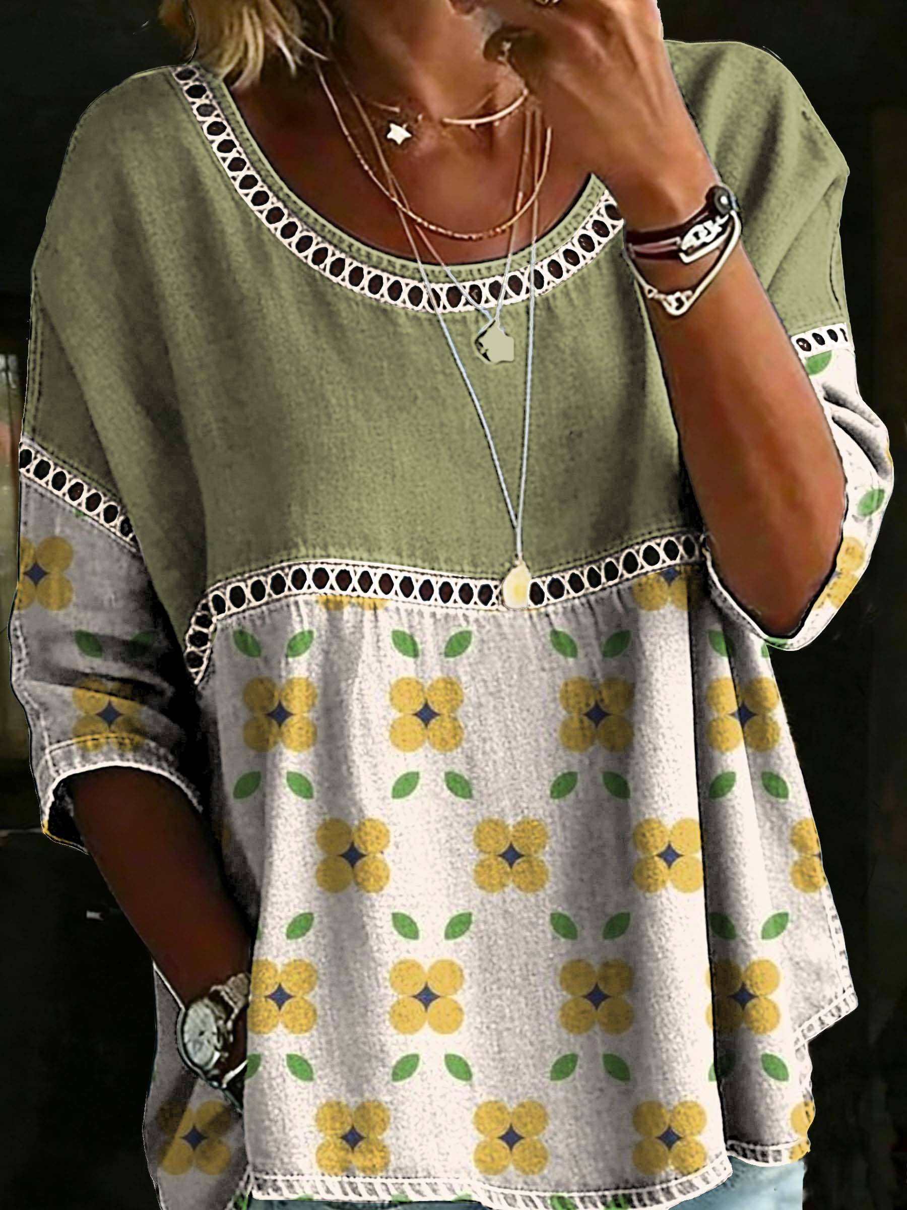 Retro Geometric Floral Art Print Casual Hollow Shirt
