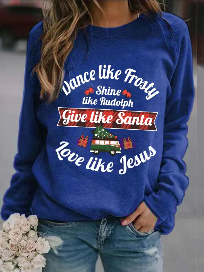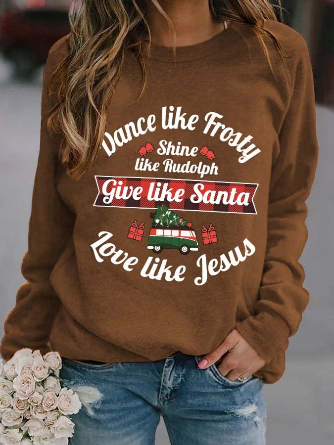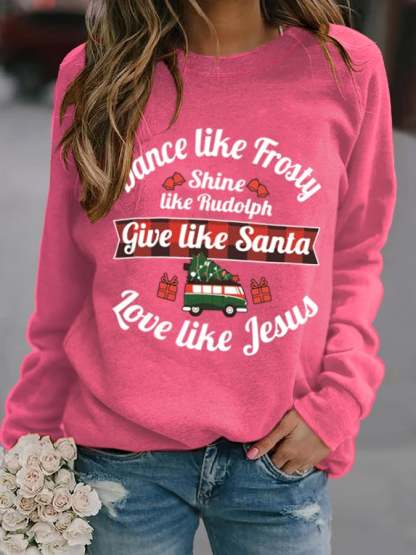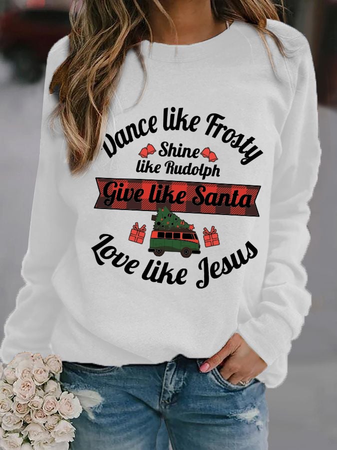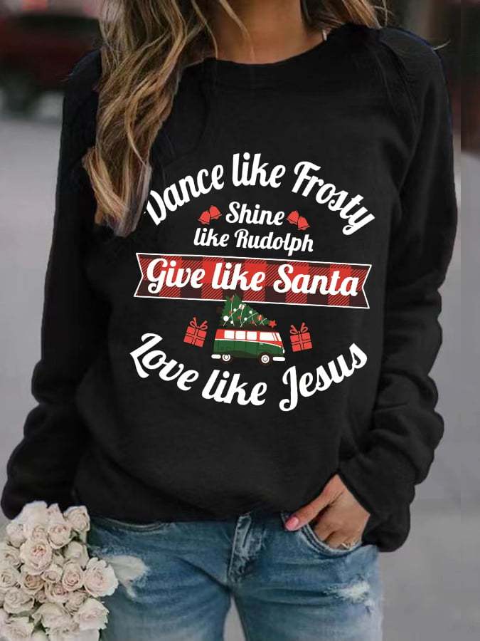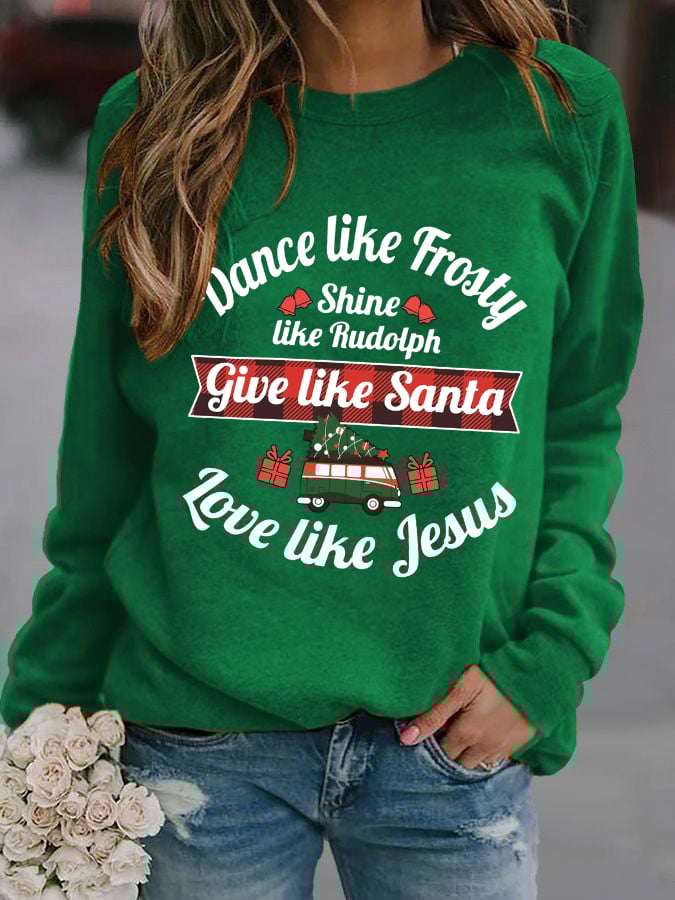Women's Dance Like Frosty, Shine Like Rudolph, Give Like Santa Love Like Jesus Print Long Sleeve Sweatshirt