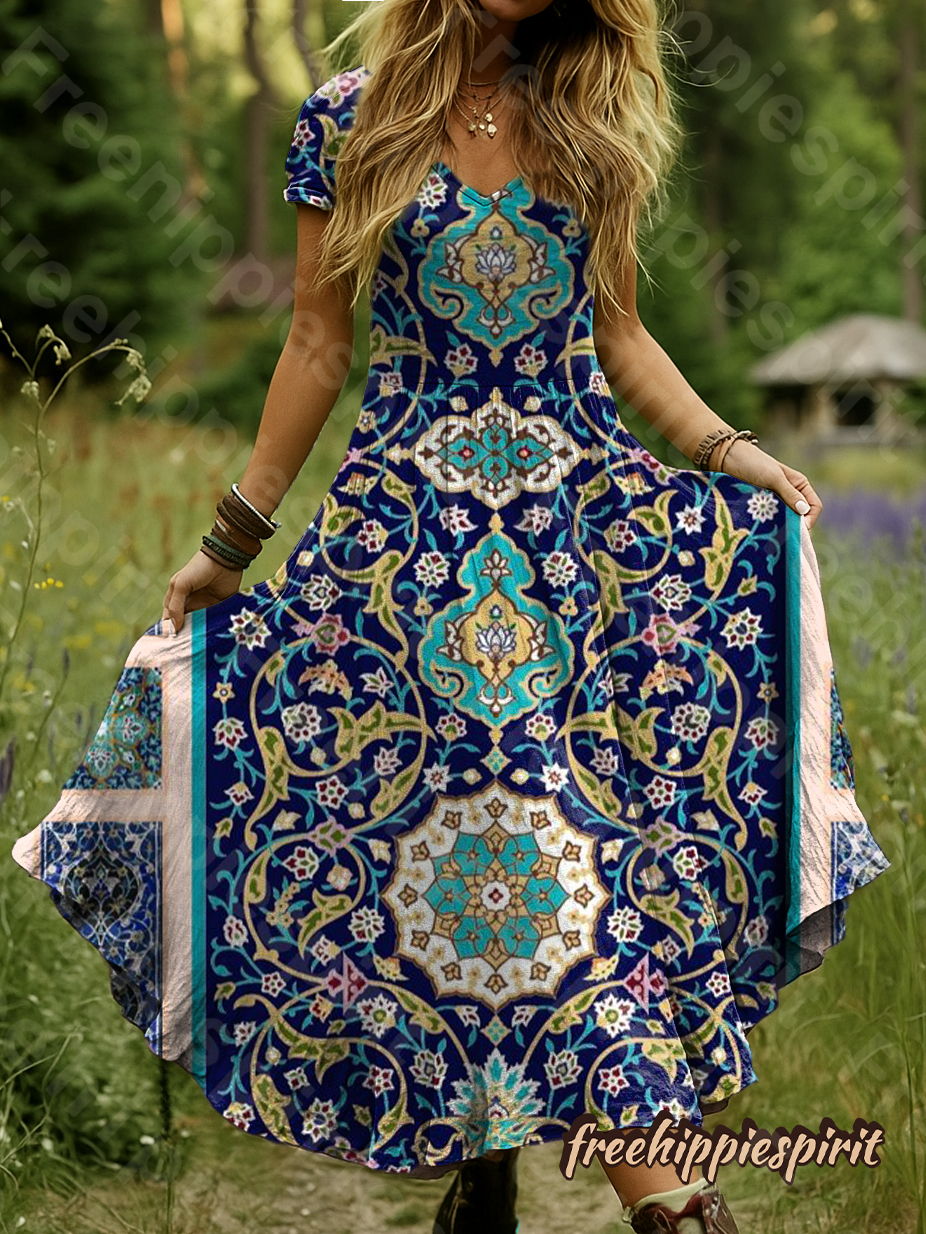 Women's Ethnic Floral Bohemian Pattern Art Print Pocket Cotton Dress