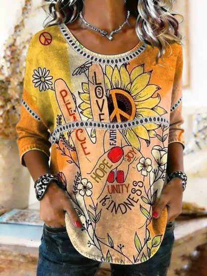Women's Hippie Peace Love Art Print Round Neck Lace Trim Shirt