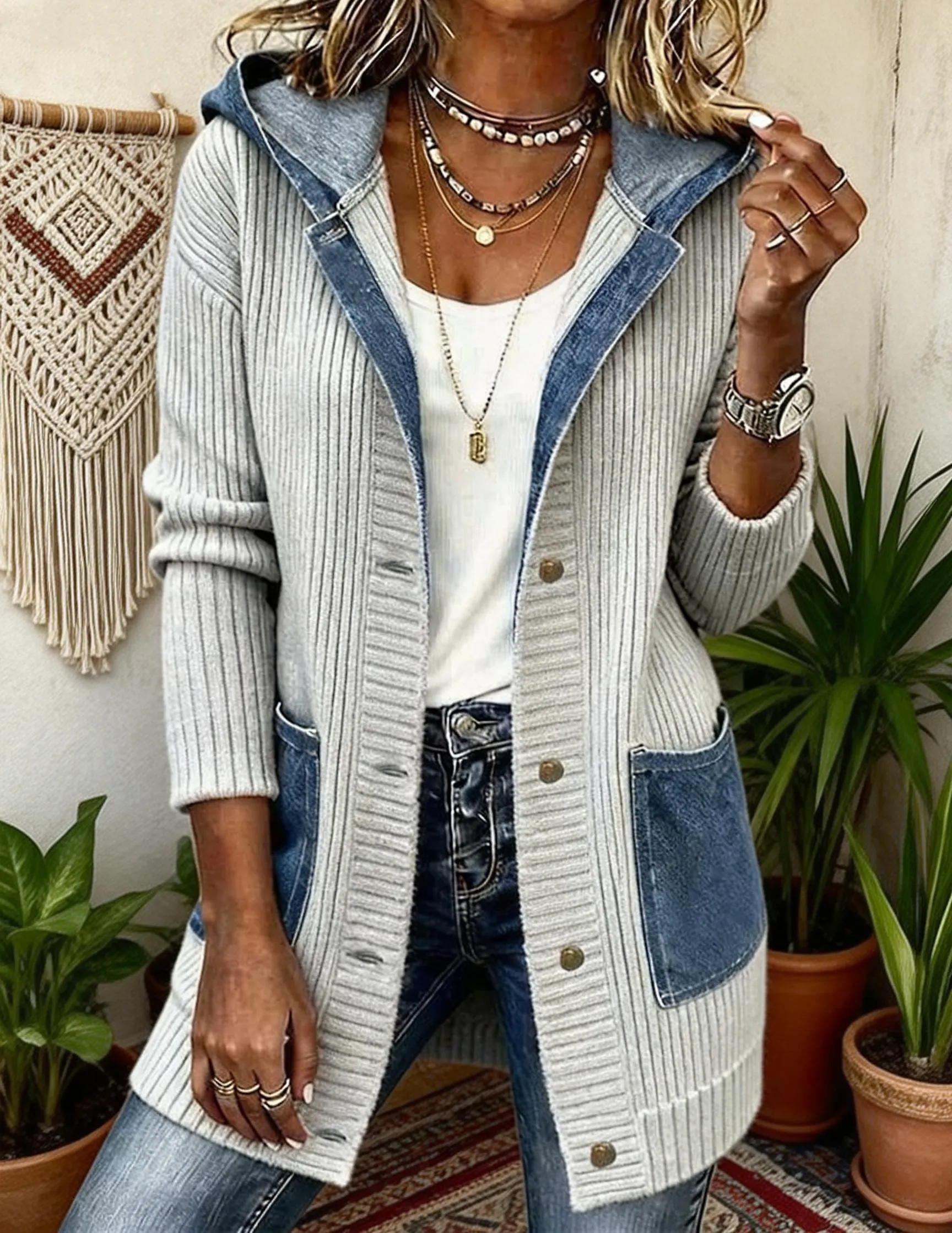 Women's Retro Casual Denim Hat Pocket Cotton Knit Cardigan