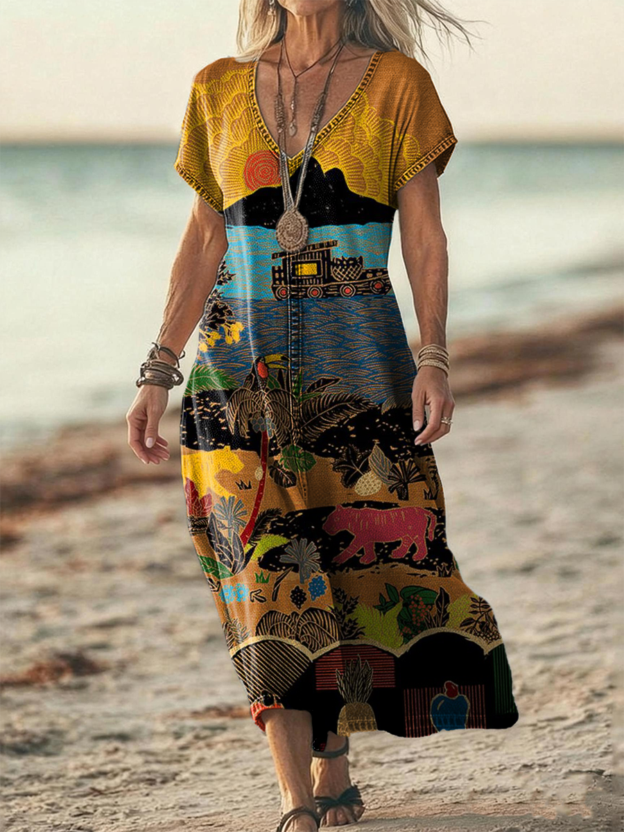 Women's Retro Ethnic Art Print Casual Short-Sleeve V-Neck Washed Cotton Denim Dress