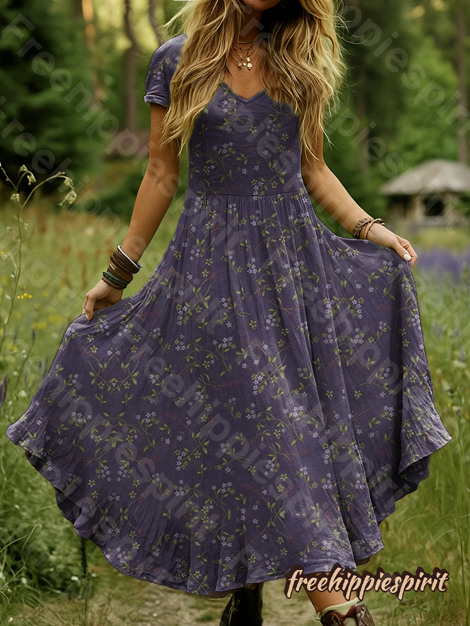 Women's Vintage Floral Art Print Pocket Cotton Dress