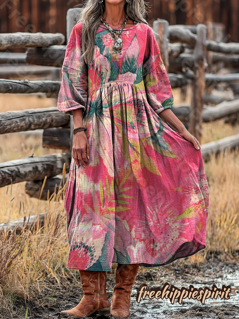 Women's Vintage Pink Floral Art Print Flowing Elegant Cotton Crew Neck Dress