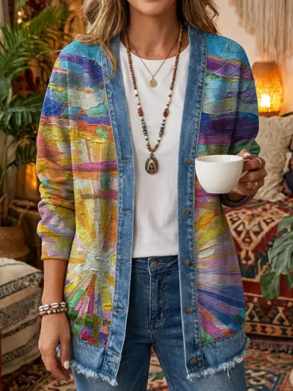 Ethnicity Doodle Sun Women's Art Print Casual Long Sleeve Denim Patchwork Shirt Coat