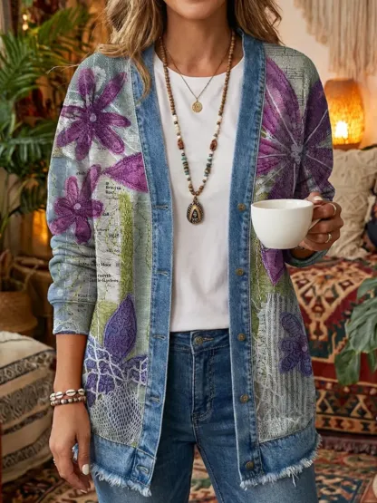 Ethnicity Flowers Patchwork Women's Art Print Casual Long Sleeve Denim Patchwork Shirt Coat