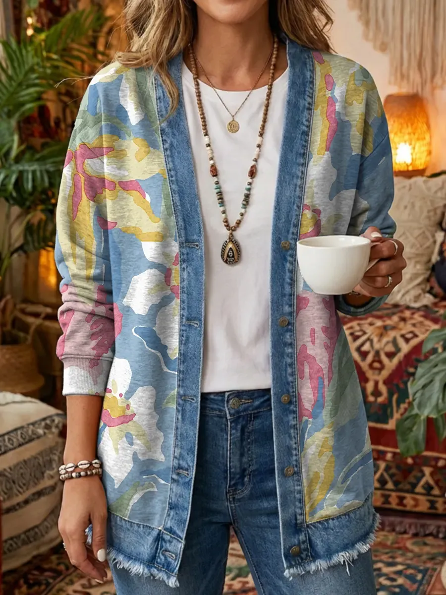 Ethnicity Light Blue Flowers Women's Art Print Casual Long Sleeve Denim Patchwork Shirt Coat