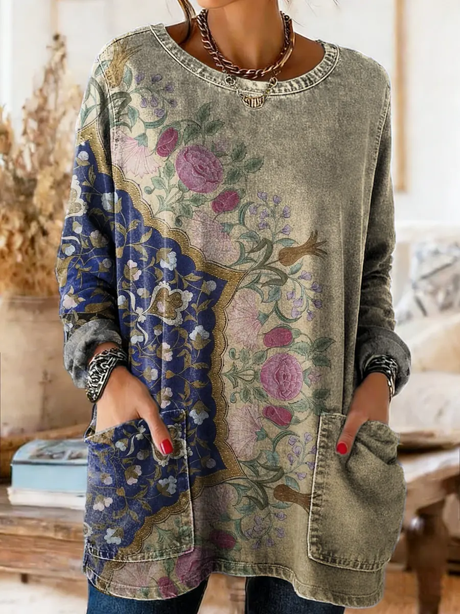 Women's Bohemian Floral Totem Art Print Casual Long-sleeved Crew Neck Pocket Washed Cotton Denim T-shirt