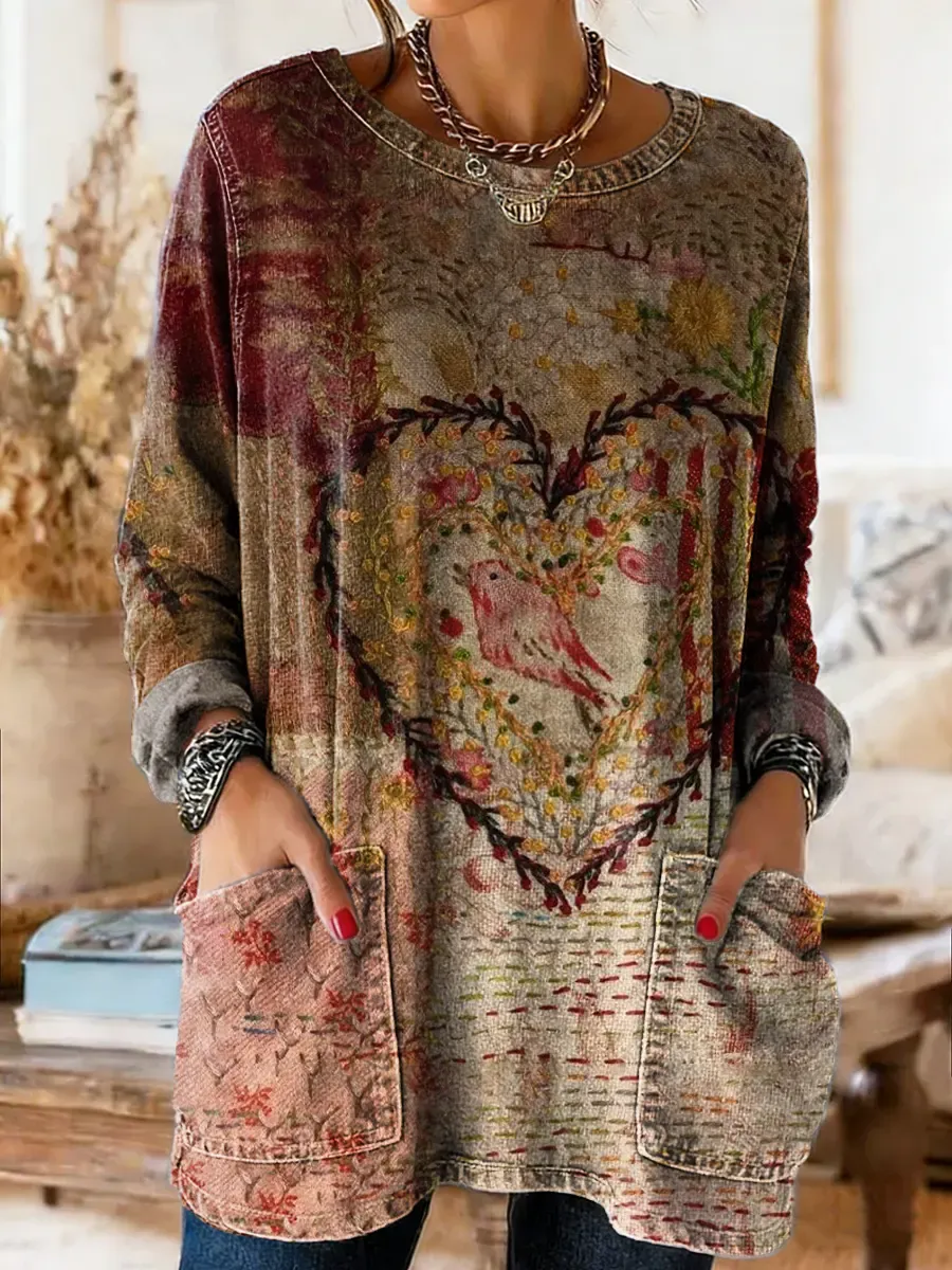 Women's Bohemian Patchwork Heart Art Print Casual Long-sleeved Crew Neck Pocket Washed Cotton Denim T-shirt