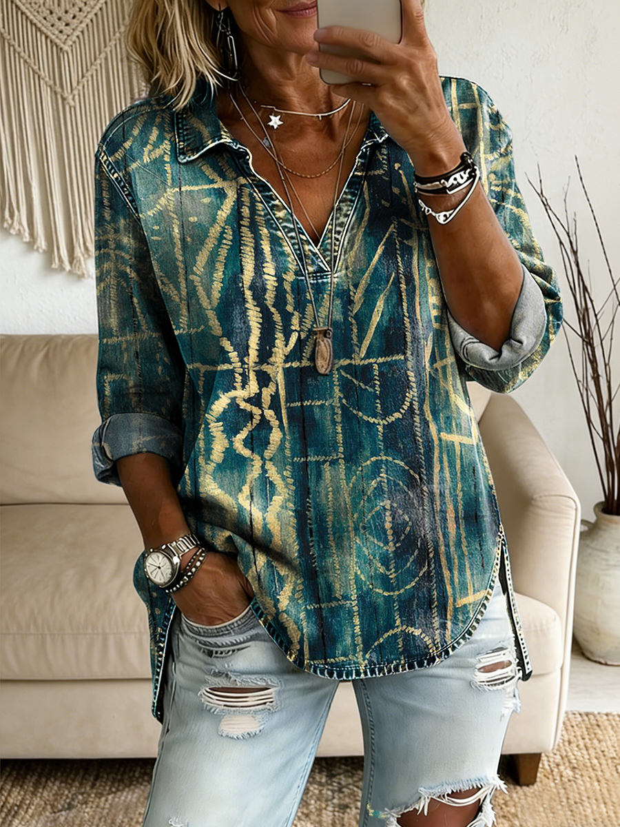 Women's Retro Art Print Casual Long-sleeved Shirt Collar Top